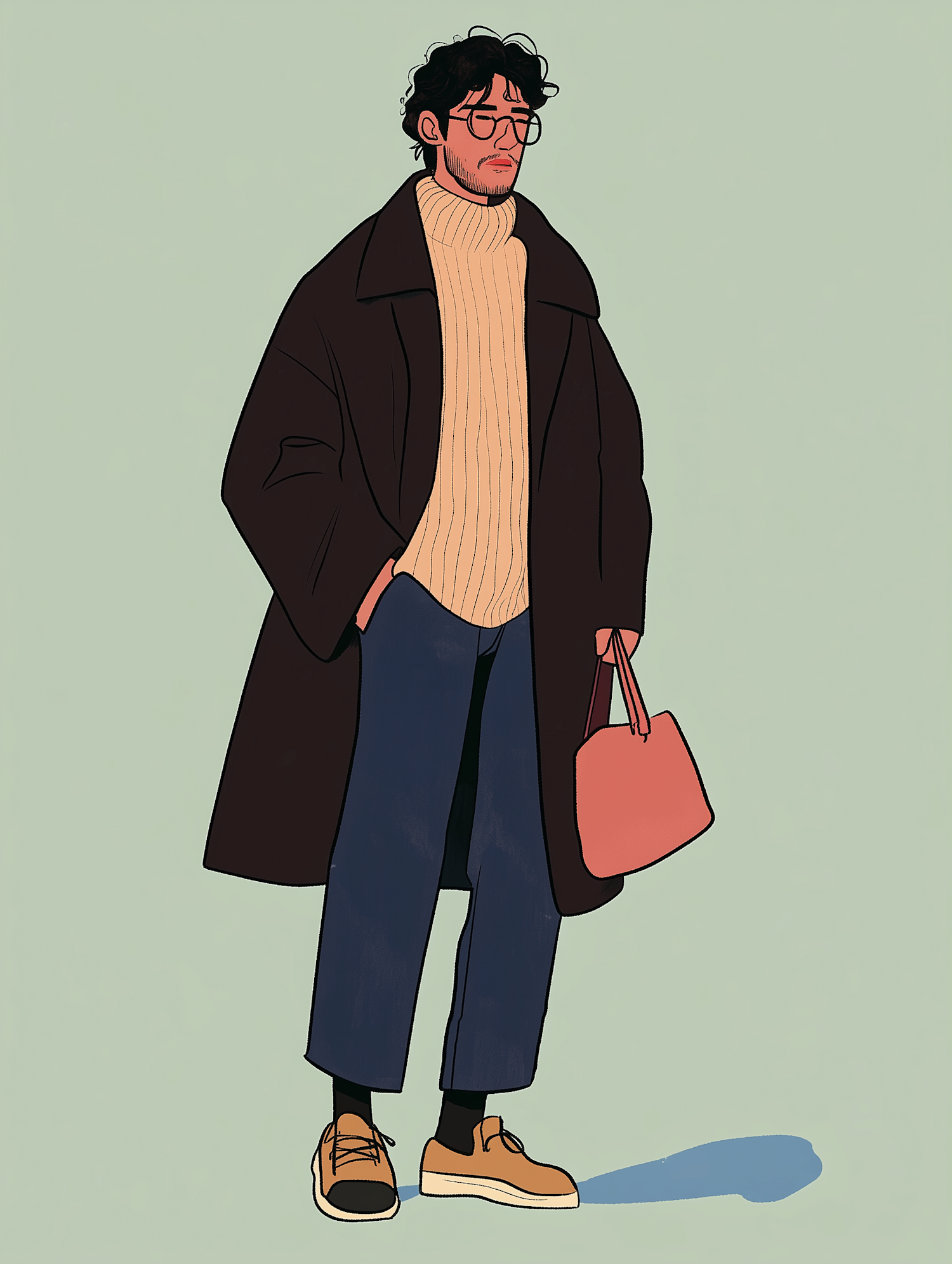 Stylish illustration of a man in a brown coat, beige sweater, and glasses, holding a tote bag against a muted green background.
