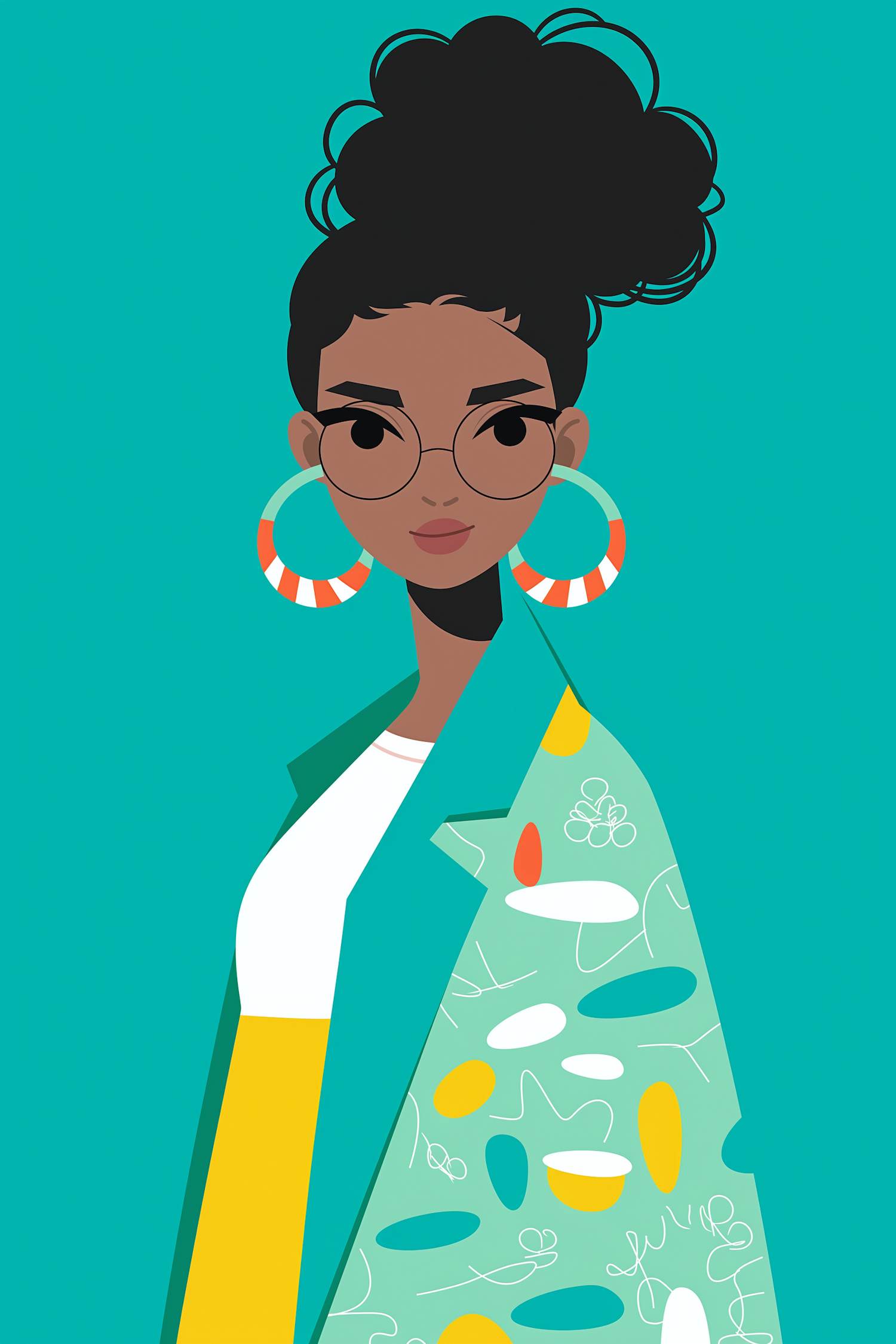 Stylish illustration of a woman with curly hair, glasses, and colorful earrings in a teal jacket with abstract patterns.