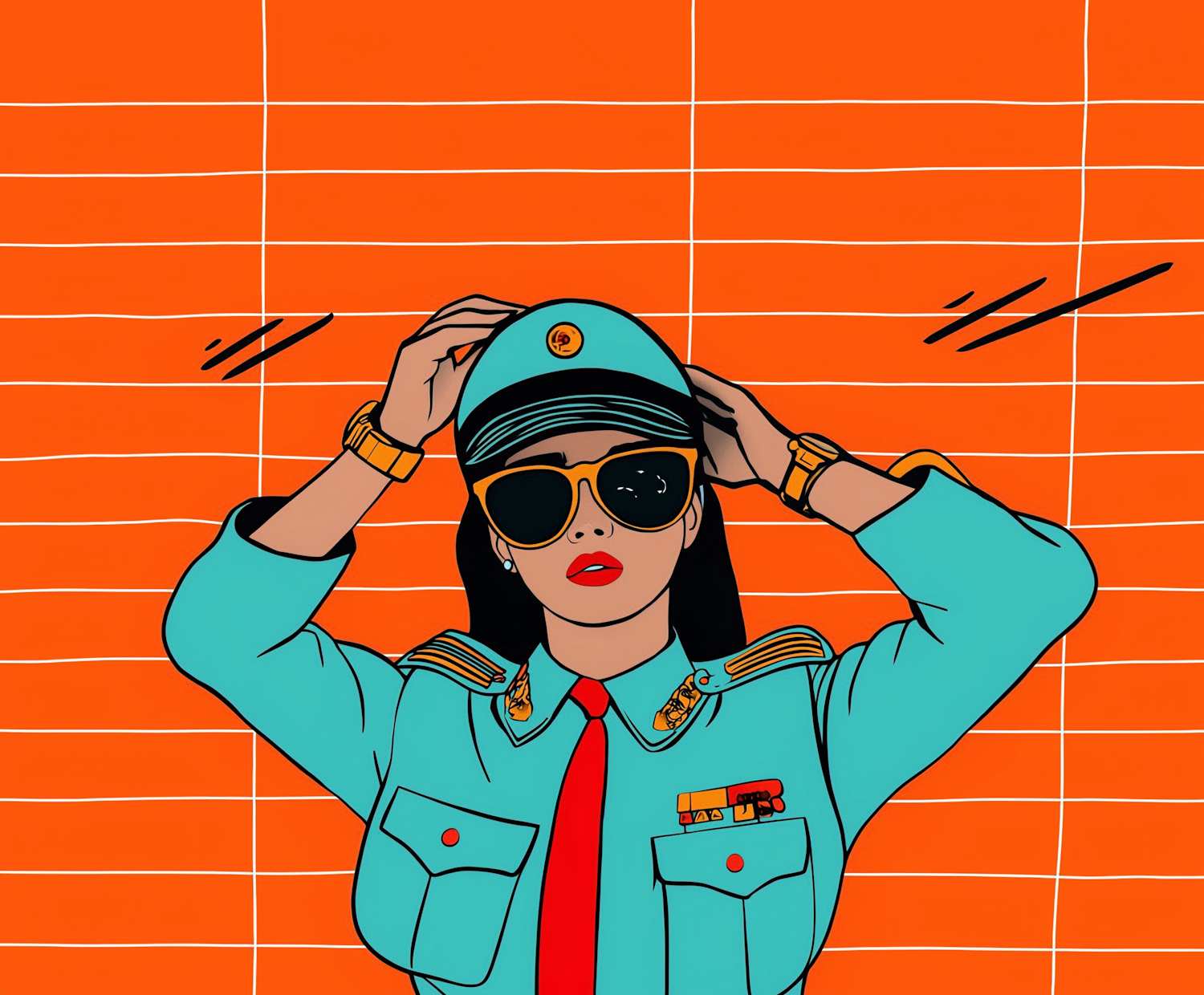 Stylized illustration of a woman in a military uniform with sunglasses, set against a vibrant orange background with grid lines.