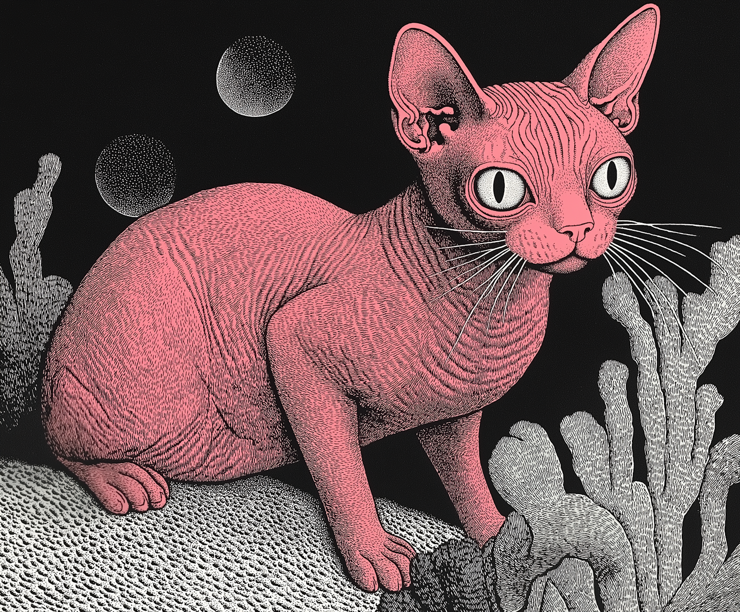 Surreal pink Sphynx cat illustration with large eyes and textured skin, set against a black background with floating spheres.