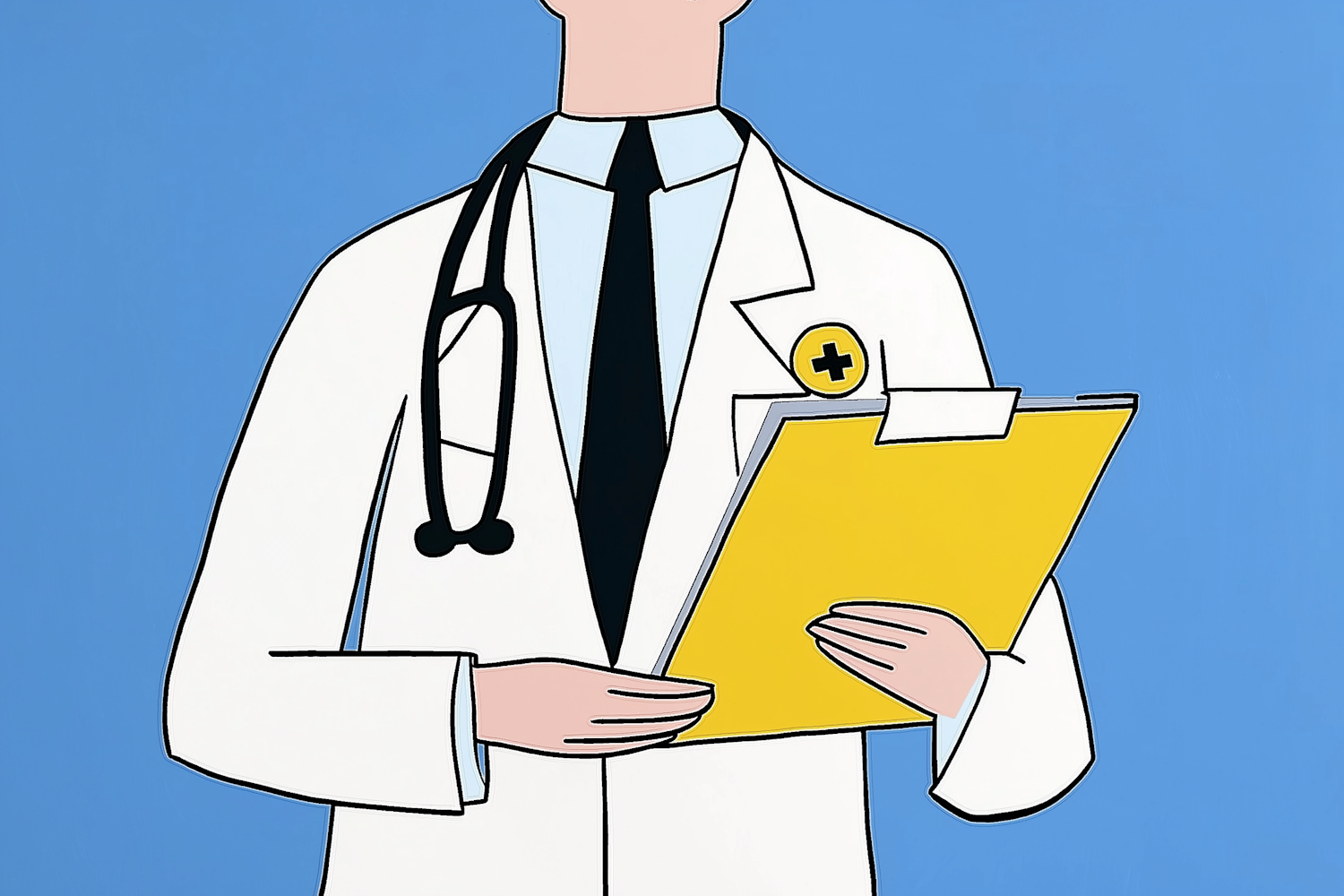 Stylized illustration of a doctor with a stethoscope and yellow clipboard on a blue background.