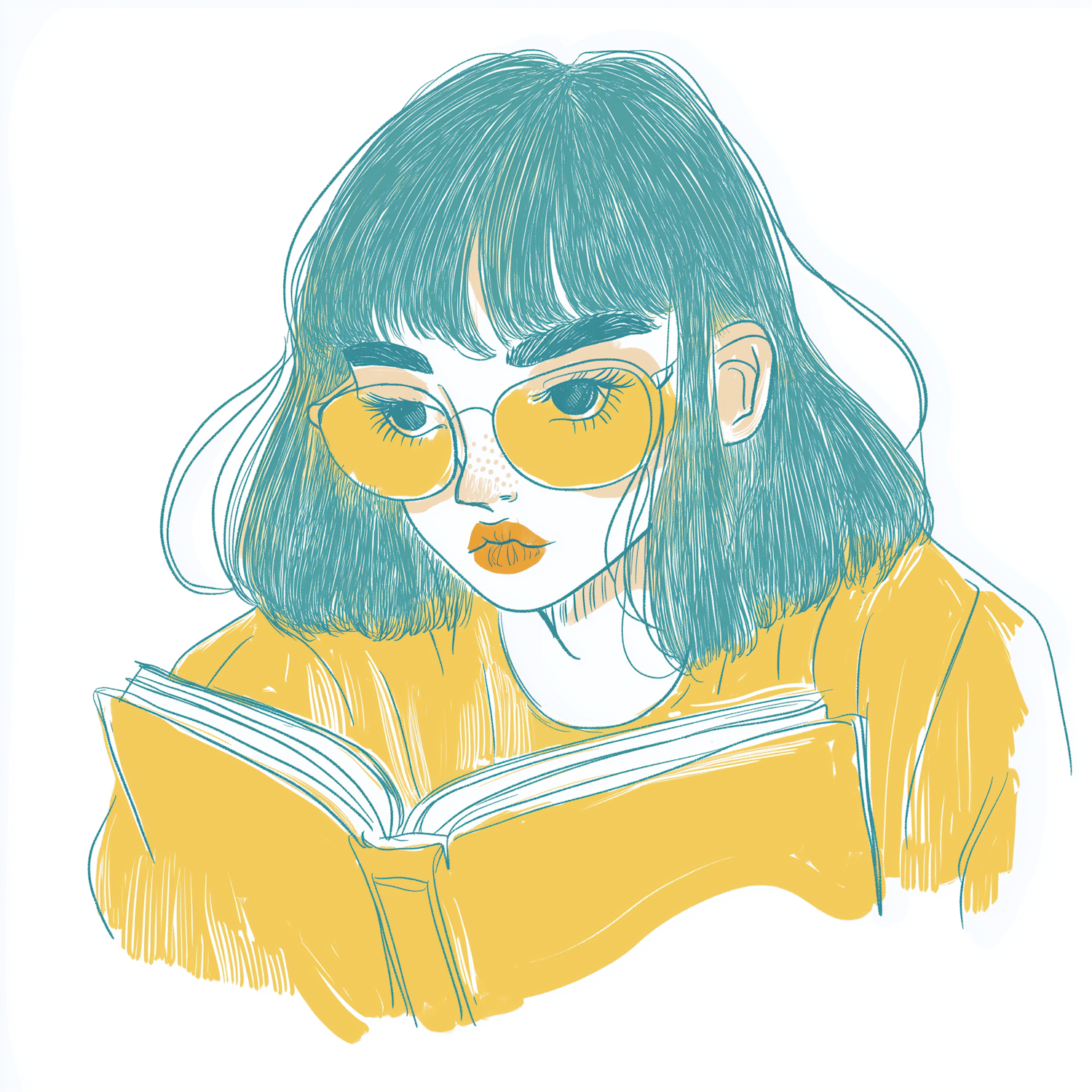 Stylized illustration of a woman with teal hair and yellow glasses reading a book, featuring a cohesive yellow and teal color scheme.