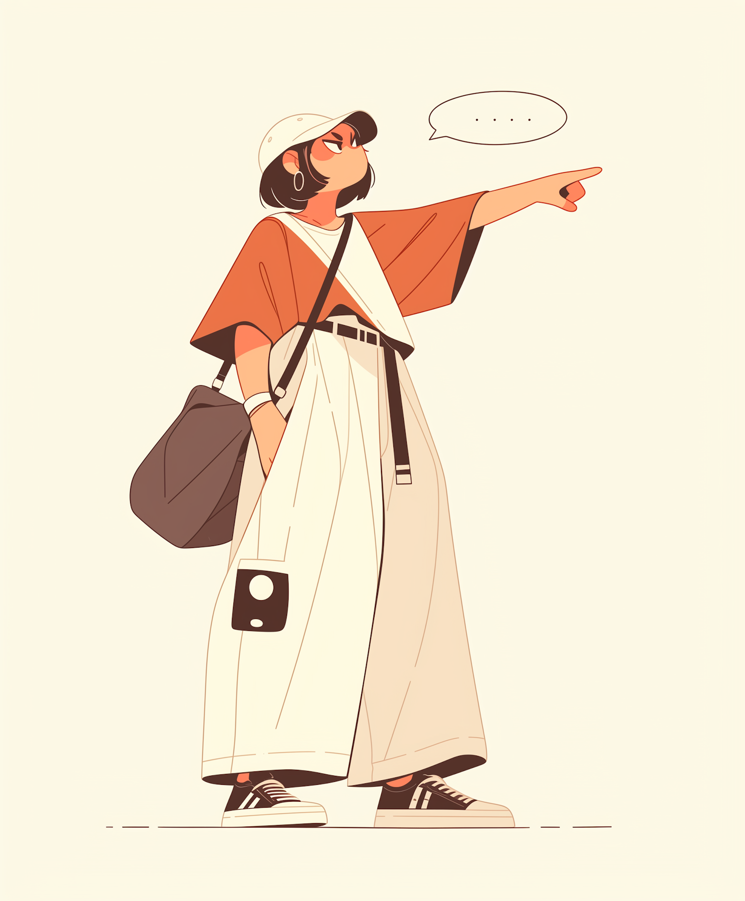 Trendy illustration of a young woman in casual attire, pointing forward with a speech bubble. Modern style with a minimalist background.