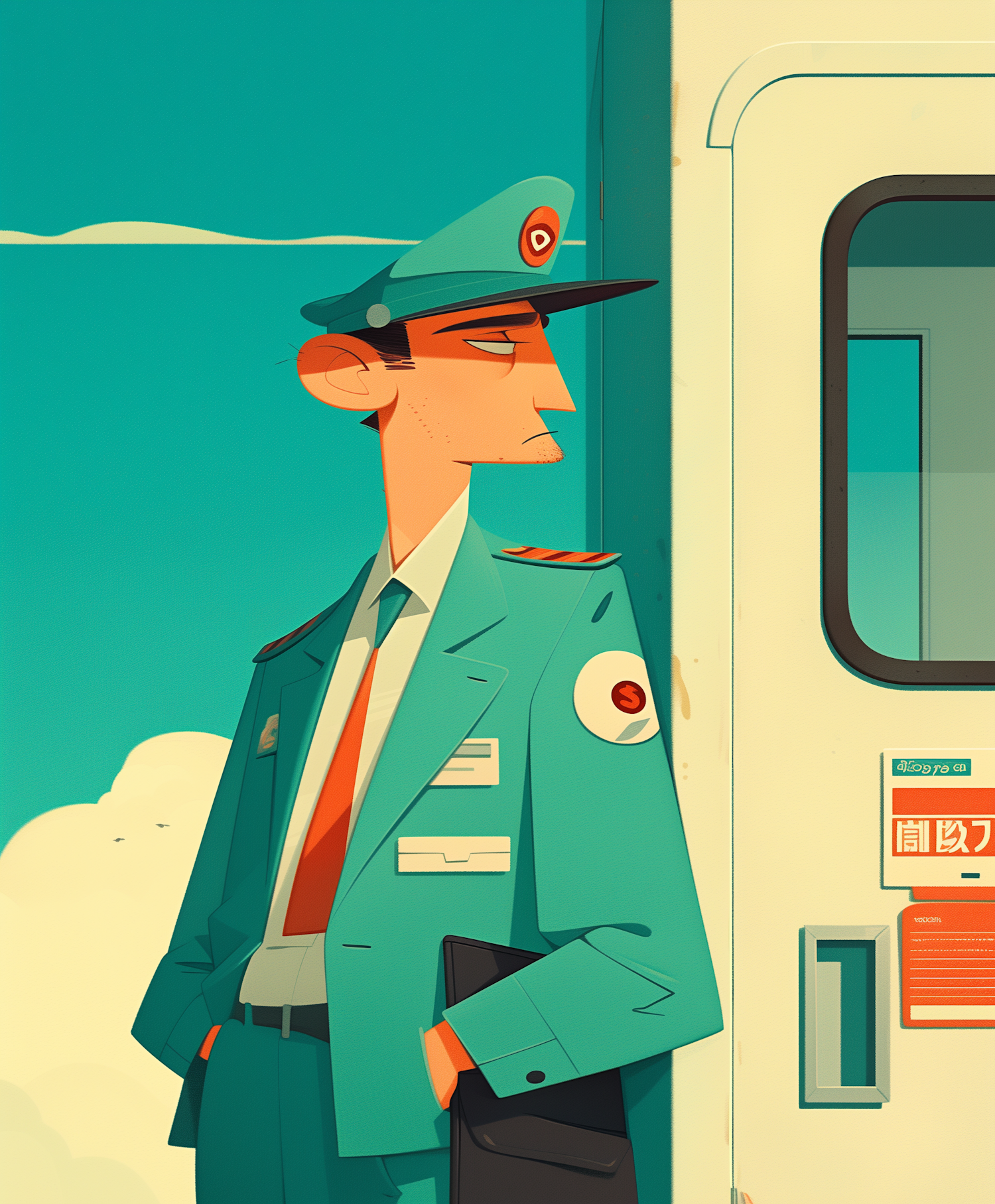 Stylized illustration of a man in a teal uniform with a briefcase, standing by a train door against a clear sky.