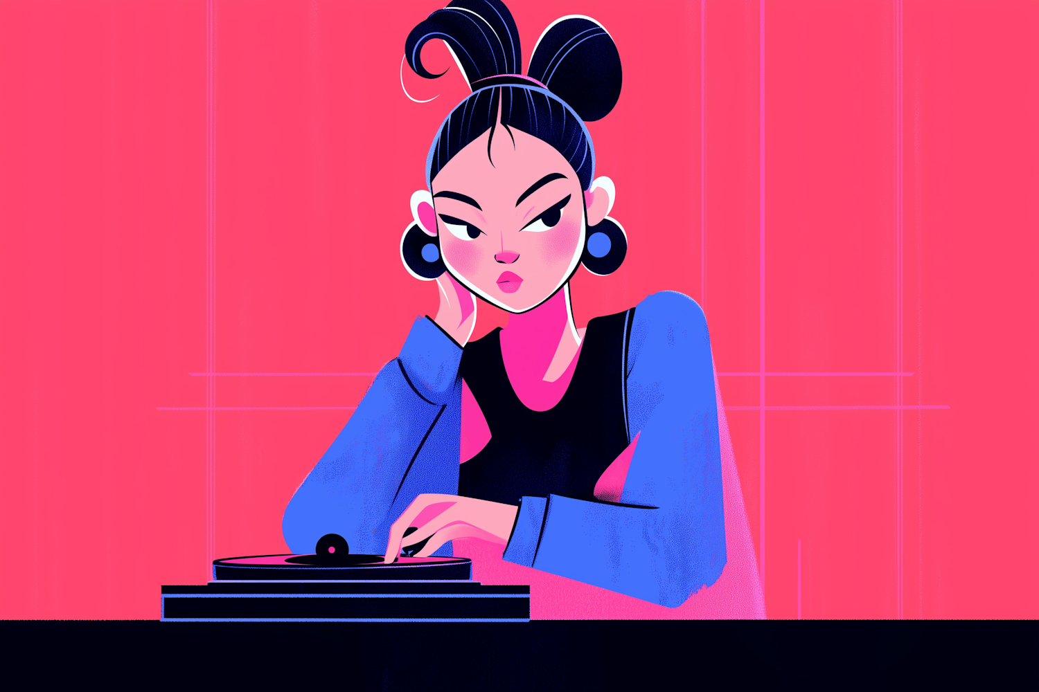 Stylized illustration of a confident female DJ with a vibrant pink background, wearing blue and black, at a turntable.
