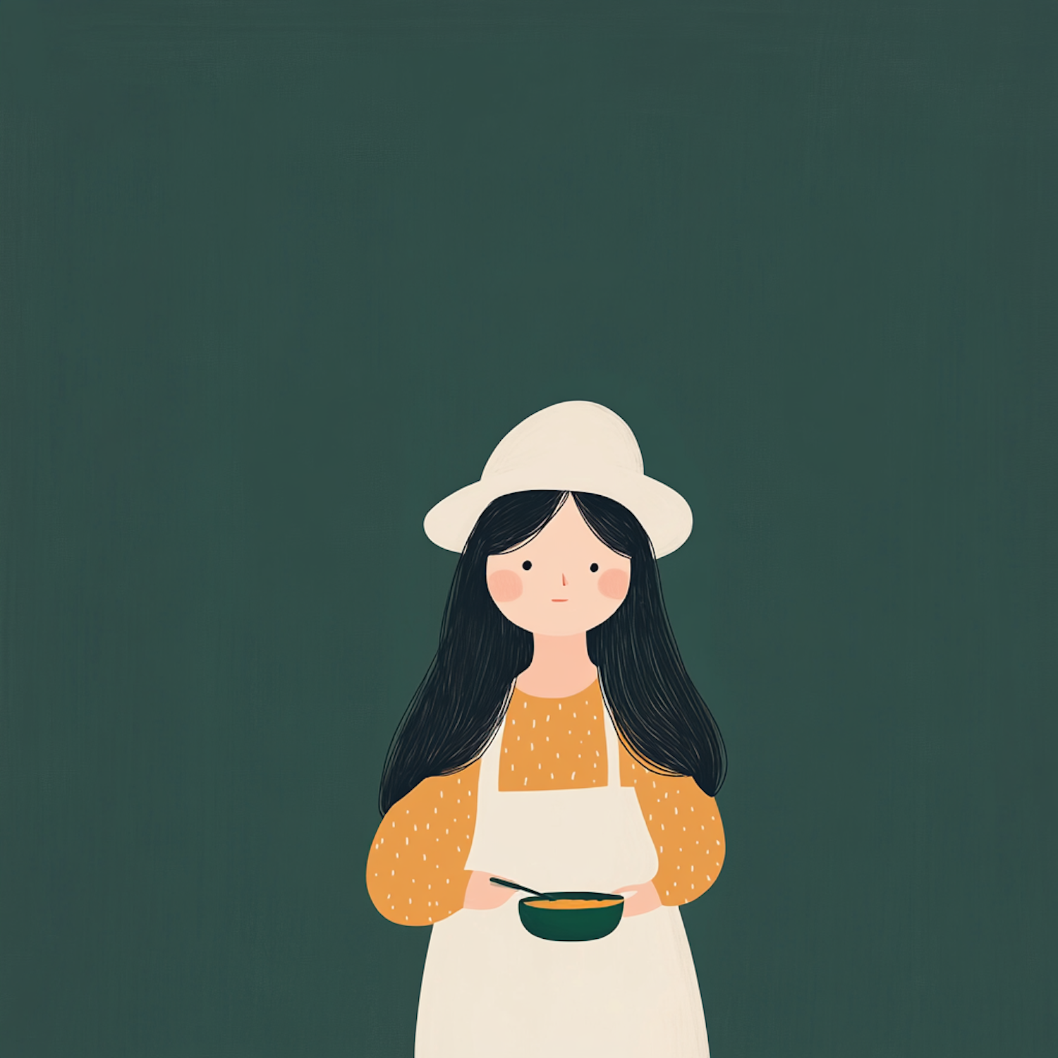 Illustration of a girl with long black hair, wearing a white hat and apron, holding a green bowl against a dark green background.