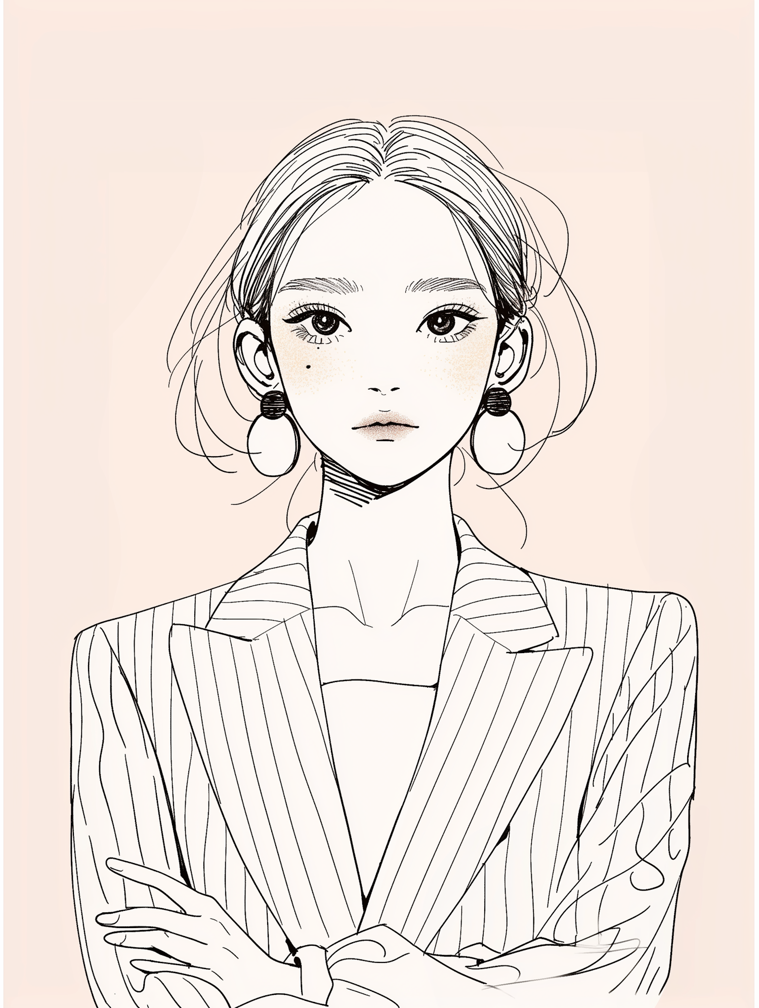 Minimalist illustration of a poised woman in a pinstriped blazer, large earrings, and soft beige background. Elegant and modern design.