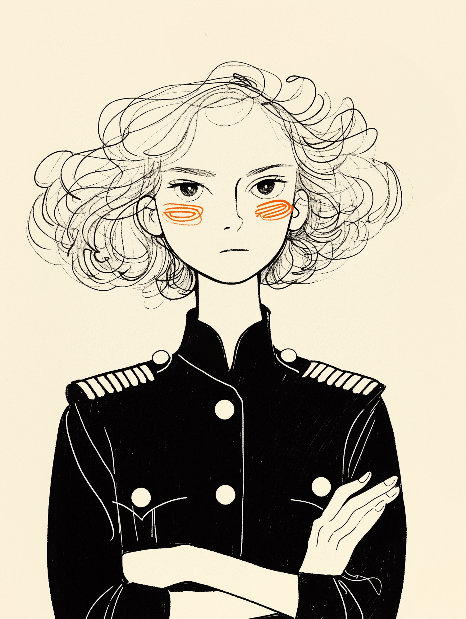 Stylized illustration of a confident figure in a military jacket with wavy hair and orange cheek markings, set against a beige background.