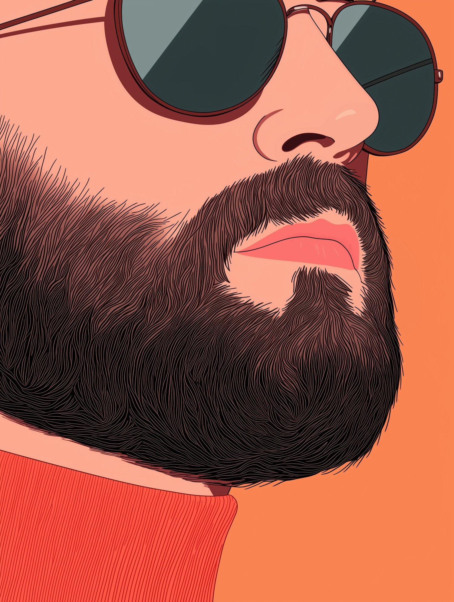 Stylized illustration of a bearded man in sunglasses and a red sweater against an orange background.