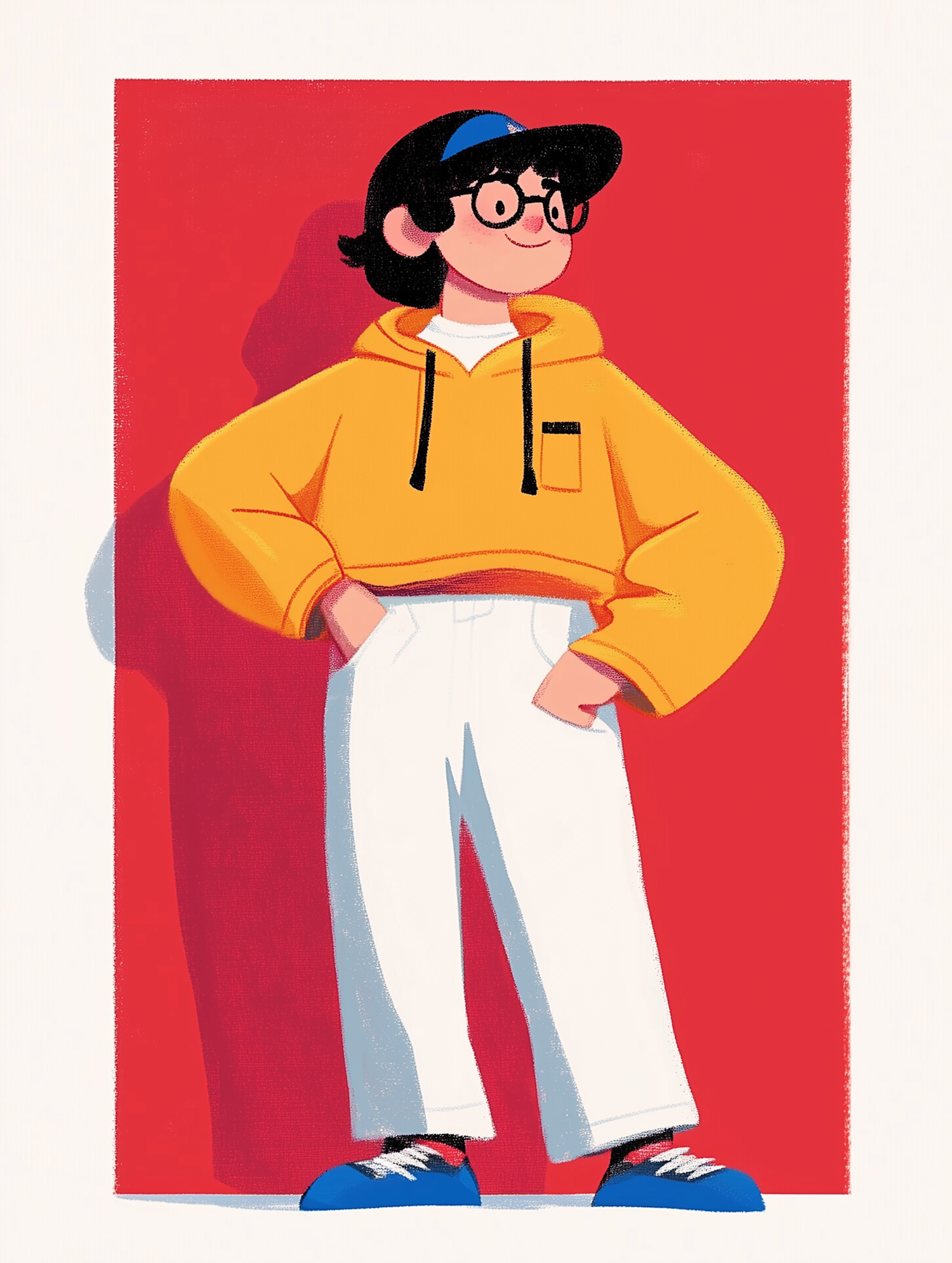 Stylish illustration of a person in a yellow hoodie, white pants, and blue sneakers, set against a bold red background.