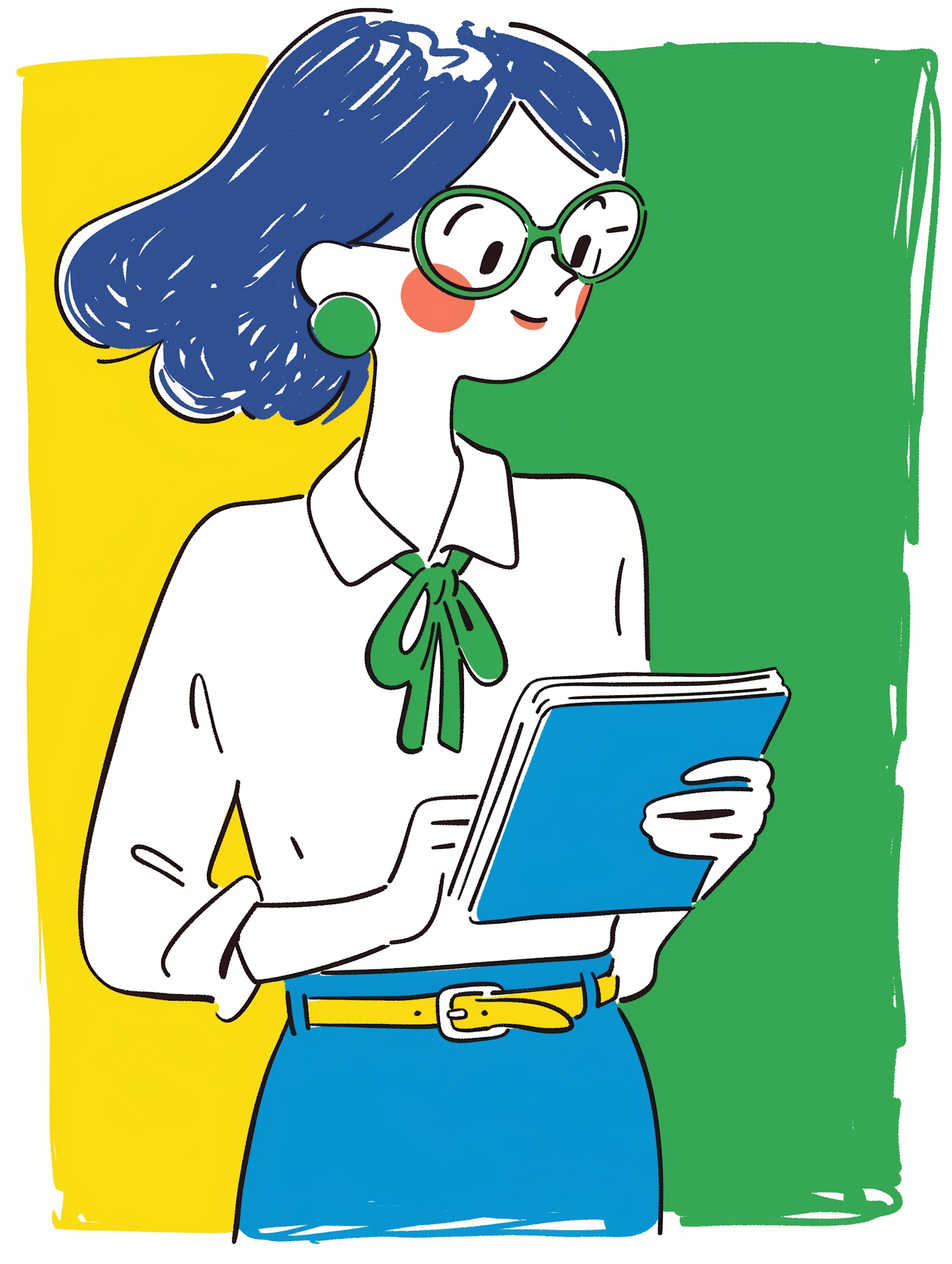 Stylized illustration of a person with blue hair, green glasses, and a book, set against a vibrant yellow and green background.