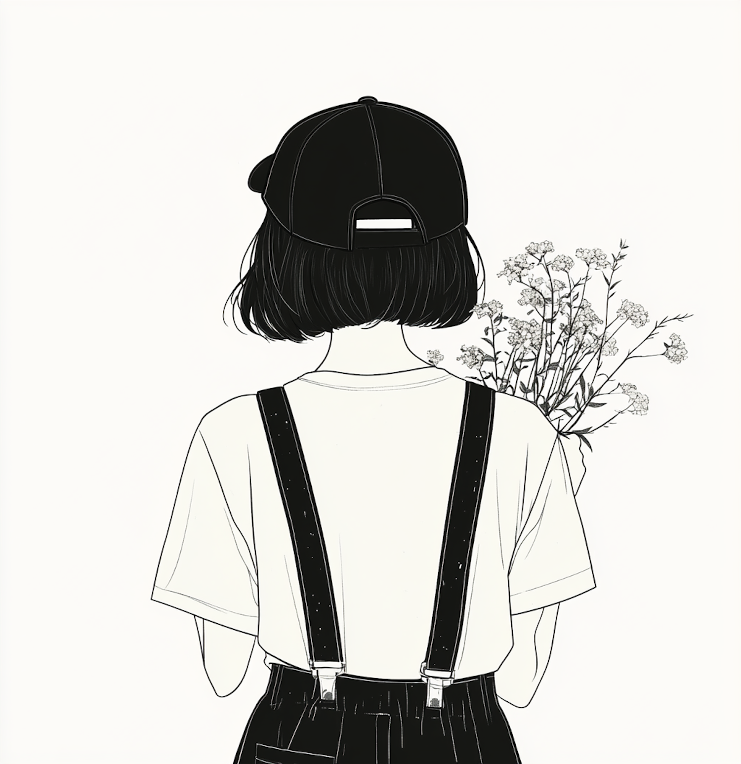 Minimalist illustration of a person with a cap and flowers, showcasing a stylish and casual look with a focus on simplicity.