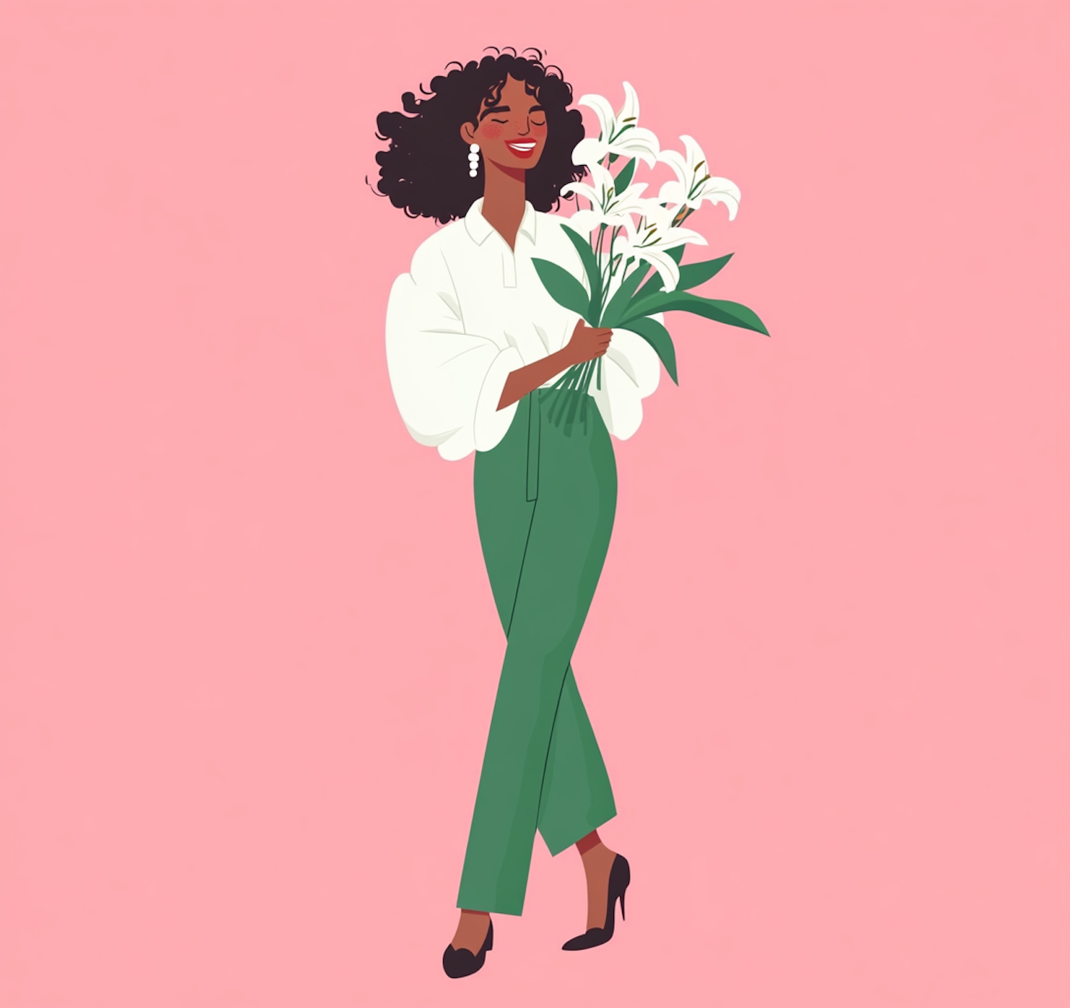 Elegant illustration of a woman with curly hair holding lilies, wearing a white blouse and green pants against a pink background.