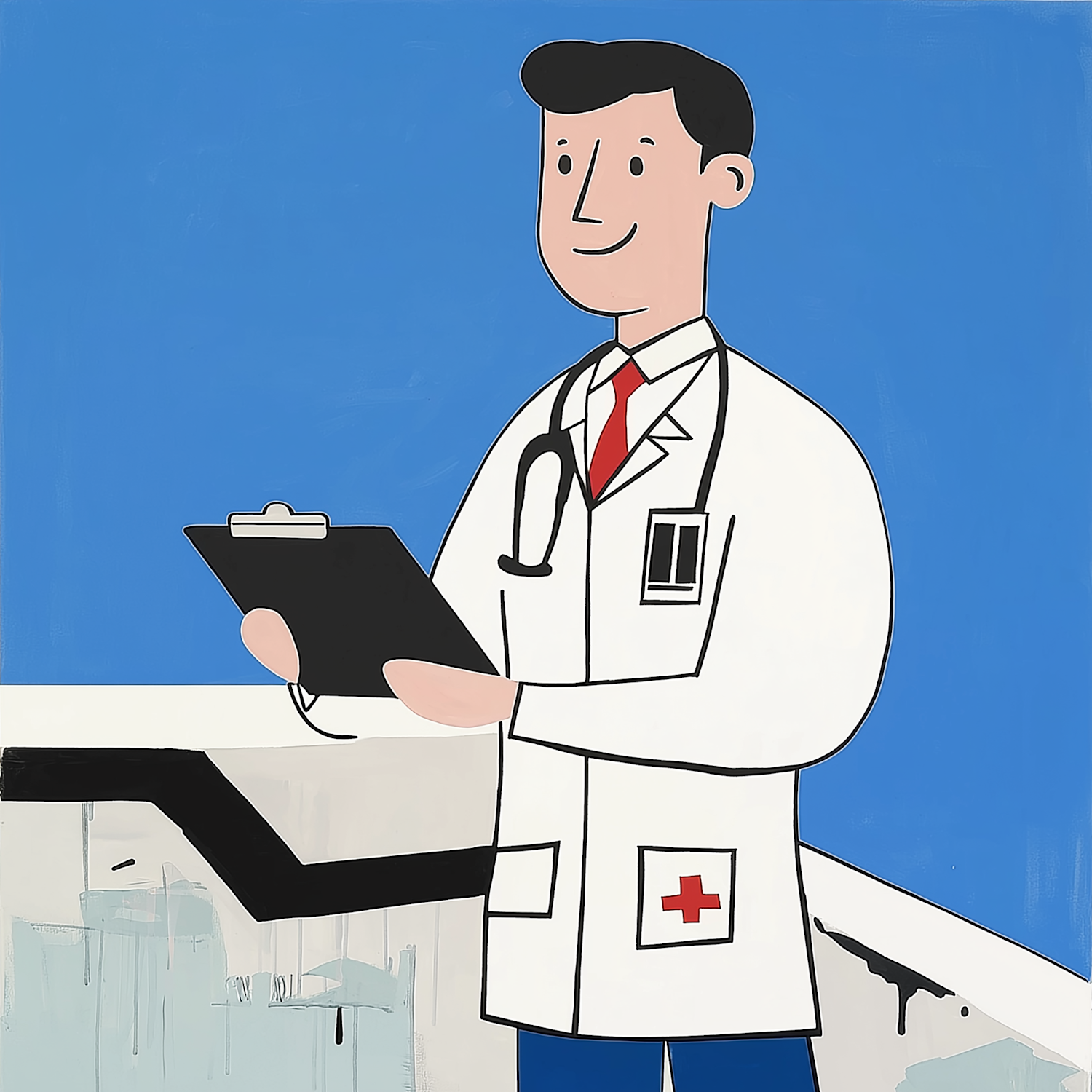 Cartoon doctor with a clipboard and stethoscope, wearing a white coat and red tie, set against a blue background.