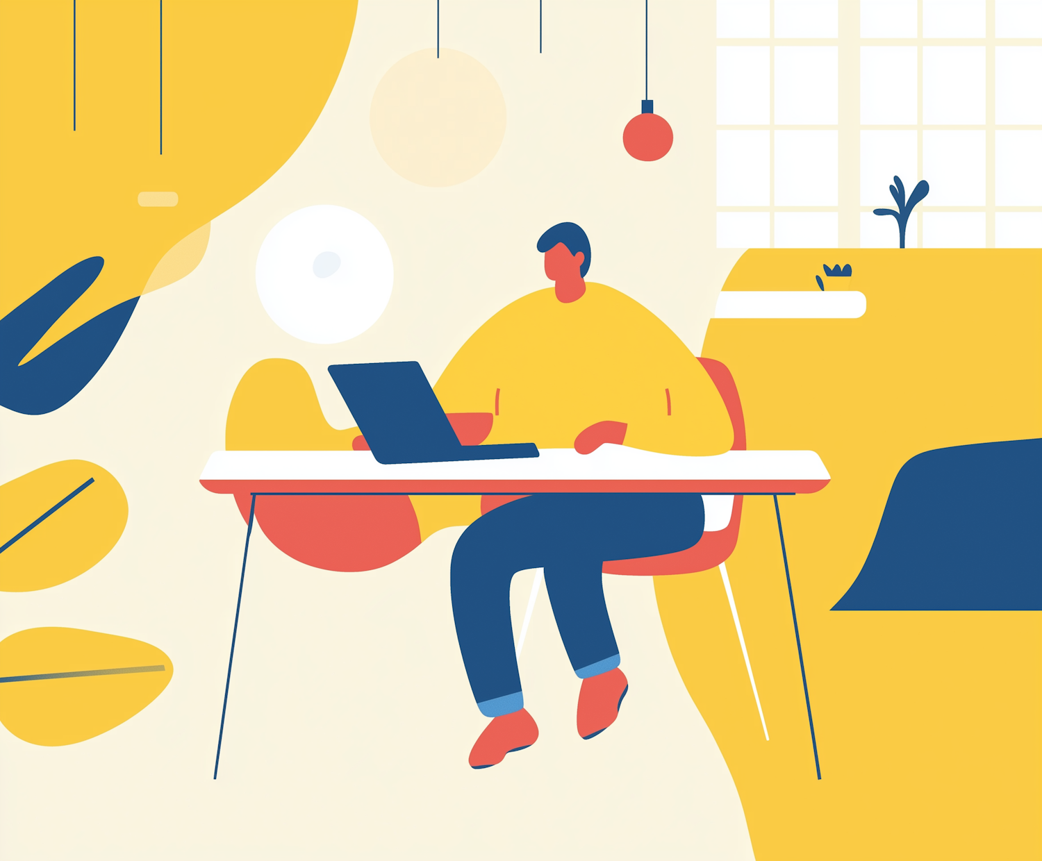 Stylized illustration of a person working on a laptop in a vibrant, modern setting with bold colors and abstract shapes.