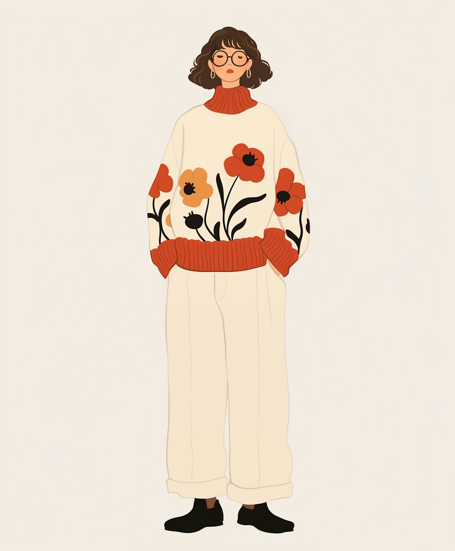 Illustration of a person in a floral sweater, cream pants, and black boots, with short brown hair and glasses on a beige background.