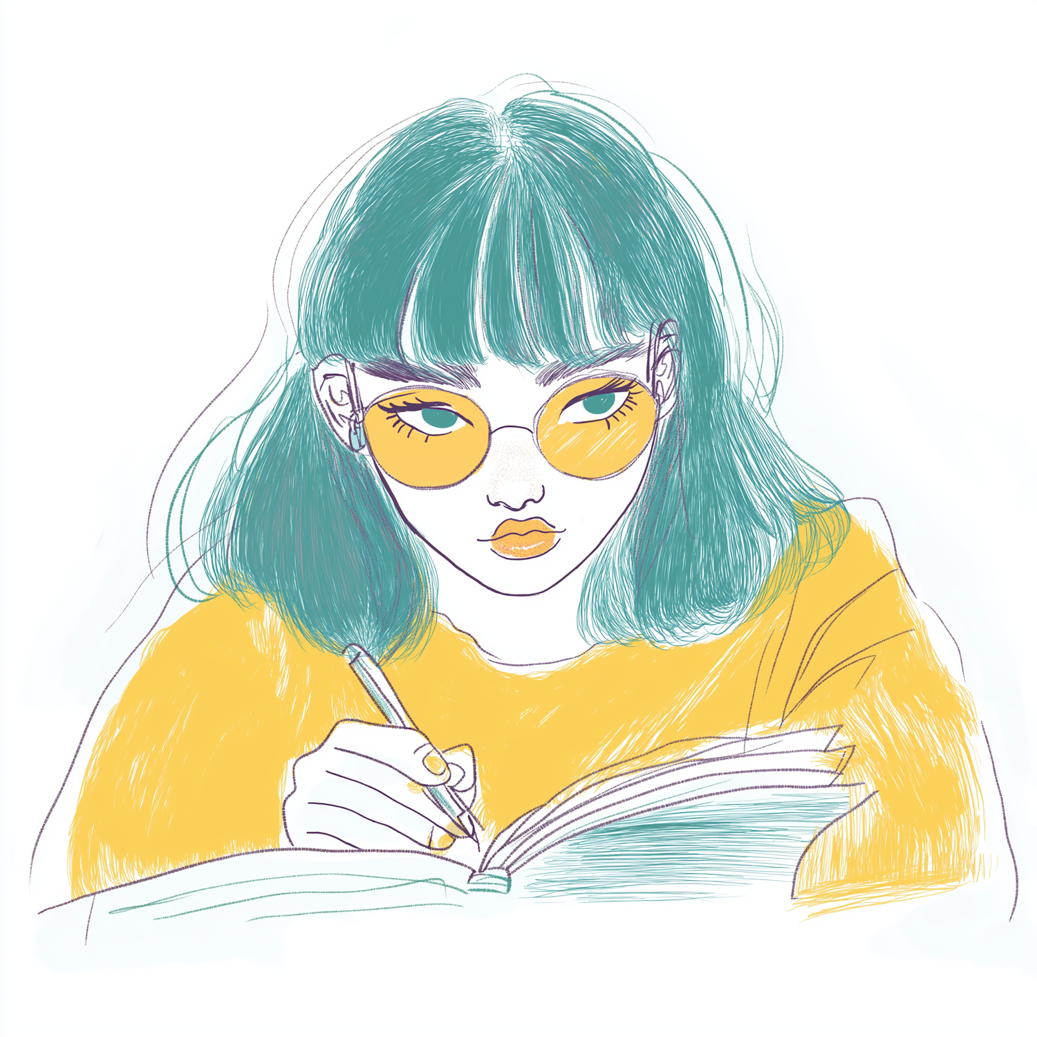 Stylized illustration of a woman with teal hair, yellow glasses, and sweater, writing in a book with a focused expression.