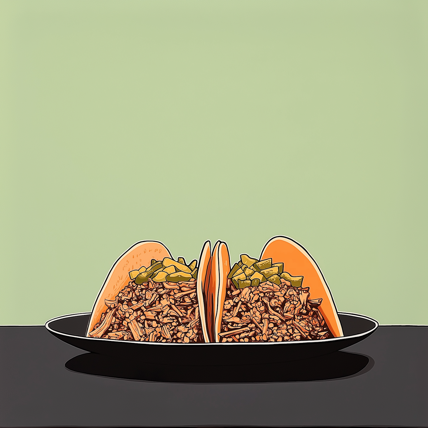 Illustration of two tacos with shredded meat and green peppers on a black plate against a light green background.