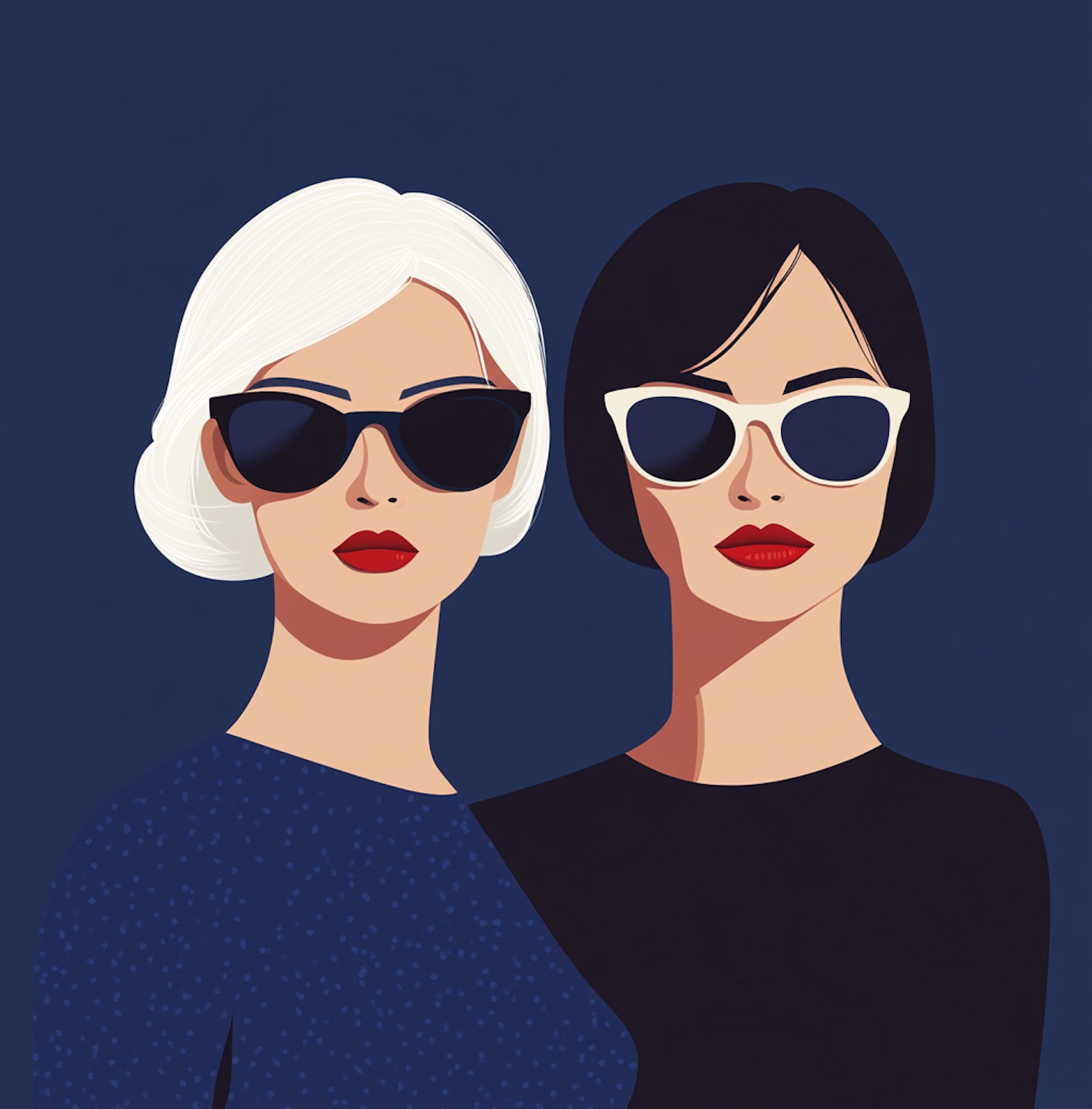 Stylized illustration of two women with sunglasses, one with white hair and blue dress, the other with black hair and black top.
