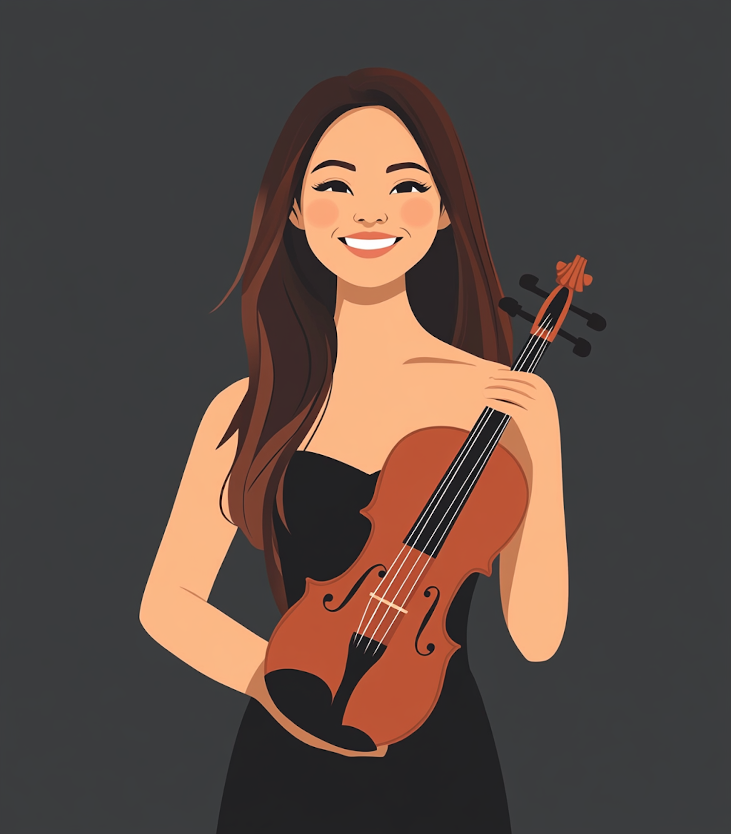 Illustration of a smiling woman holding a violin, wearing a black dress. Her joyful expression and the violin create a musical theme.