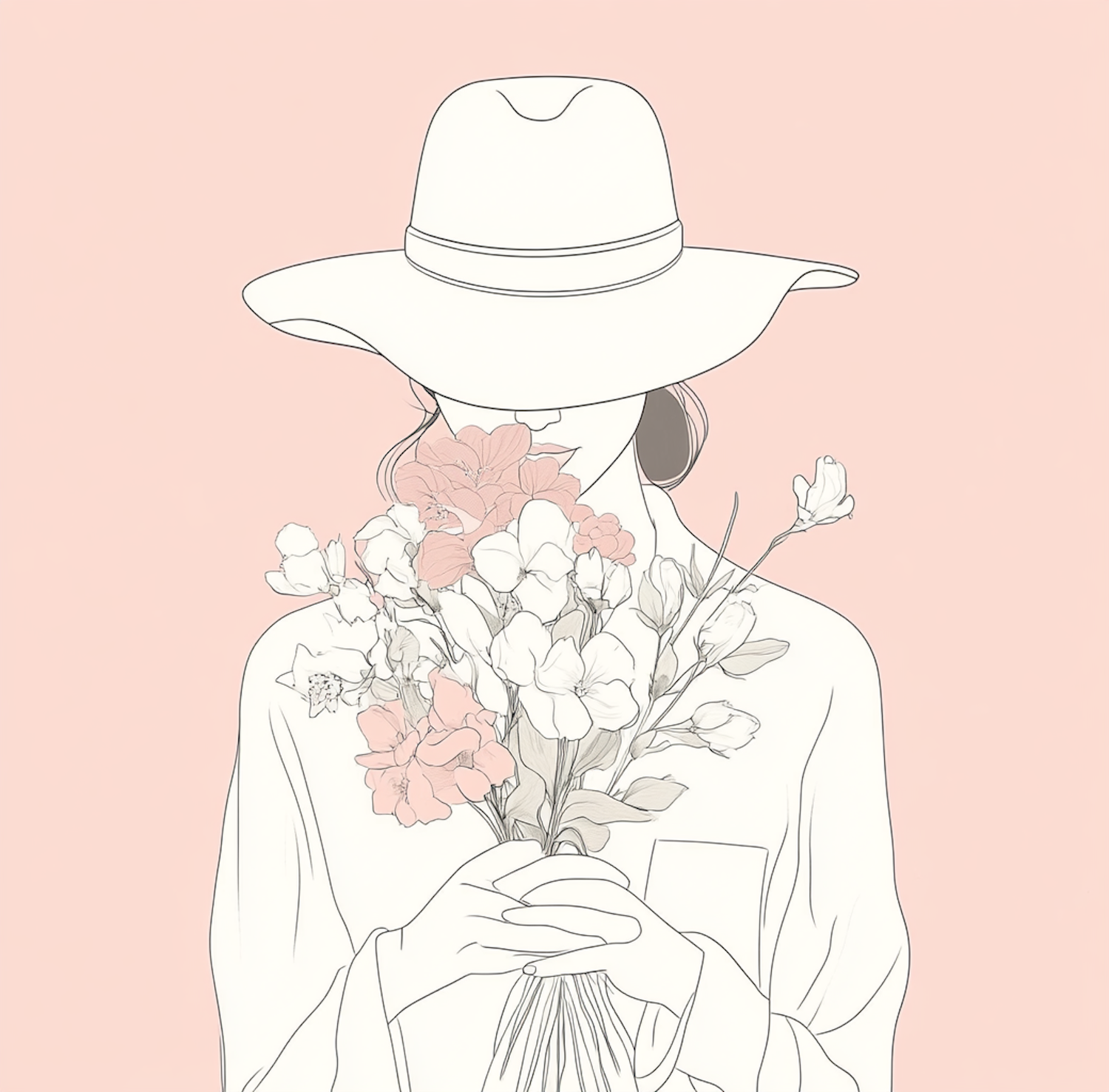 Minimalist illustration of a person with a wide-brimmed hat holding a bouquet of flowers against a soft peach background.