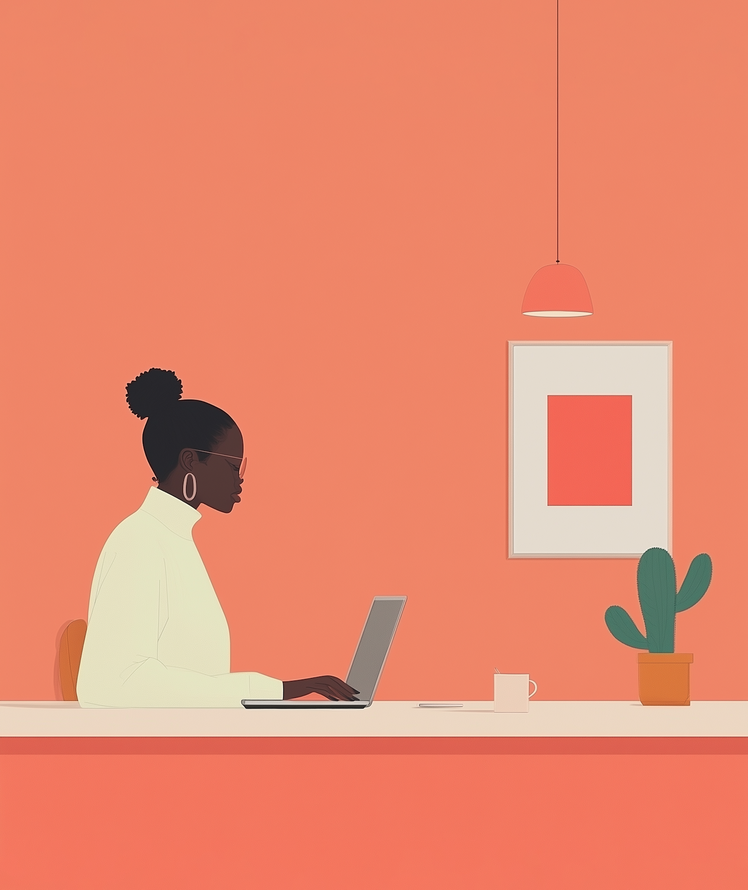 Minimalist illustration of a woman working on a laptop in a peach-colored room with a cactus and modern decor.