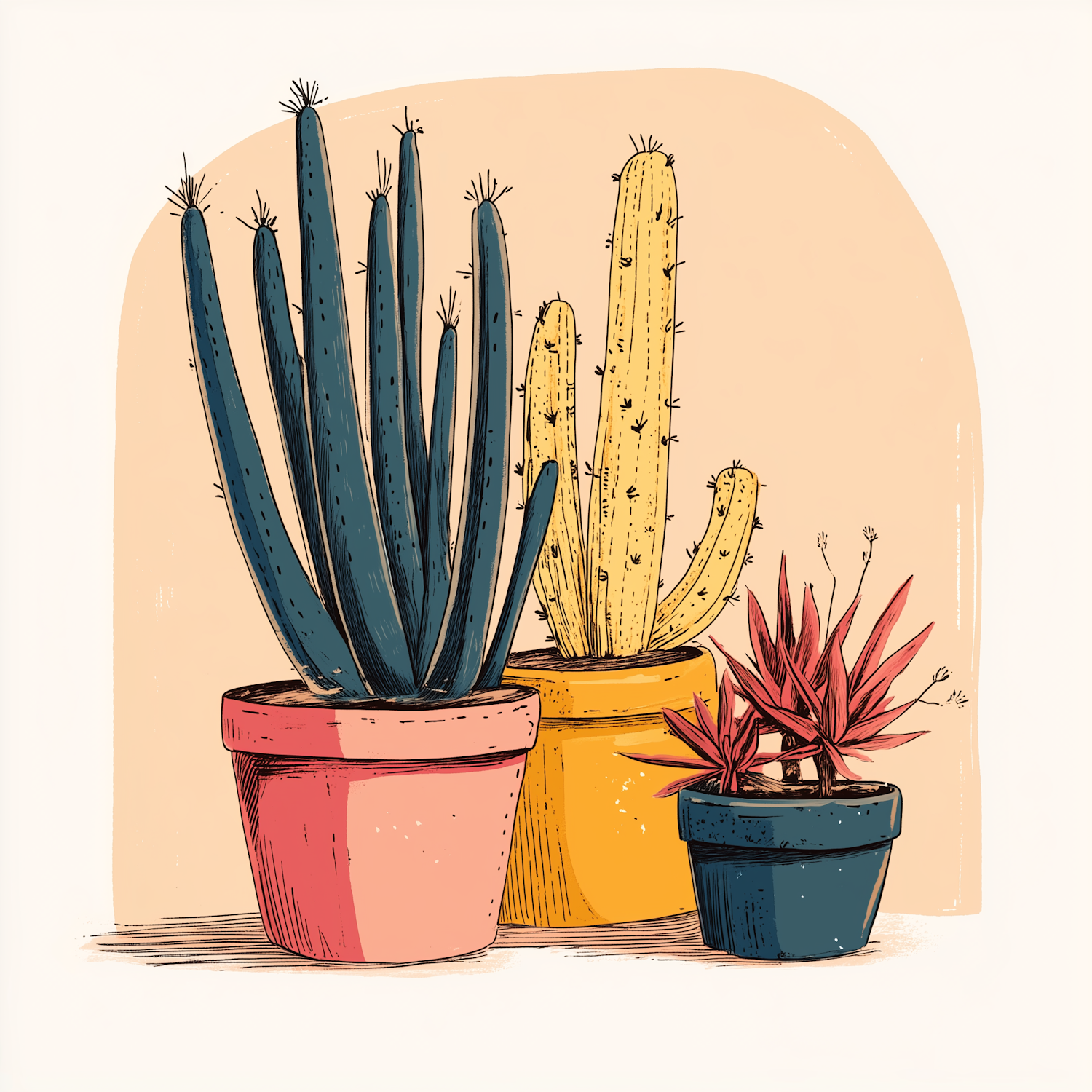 Vibrant illustration of three potted cacti in colorful pots against a soft beige background.