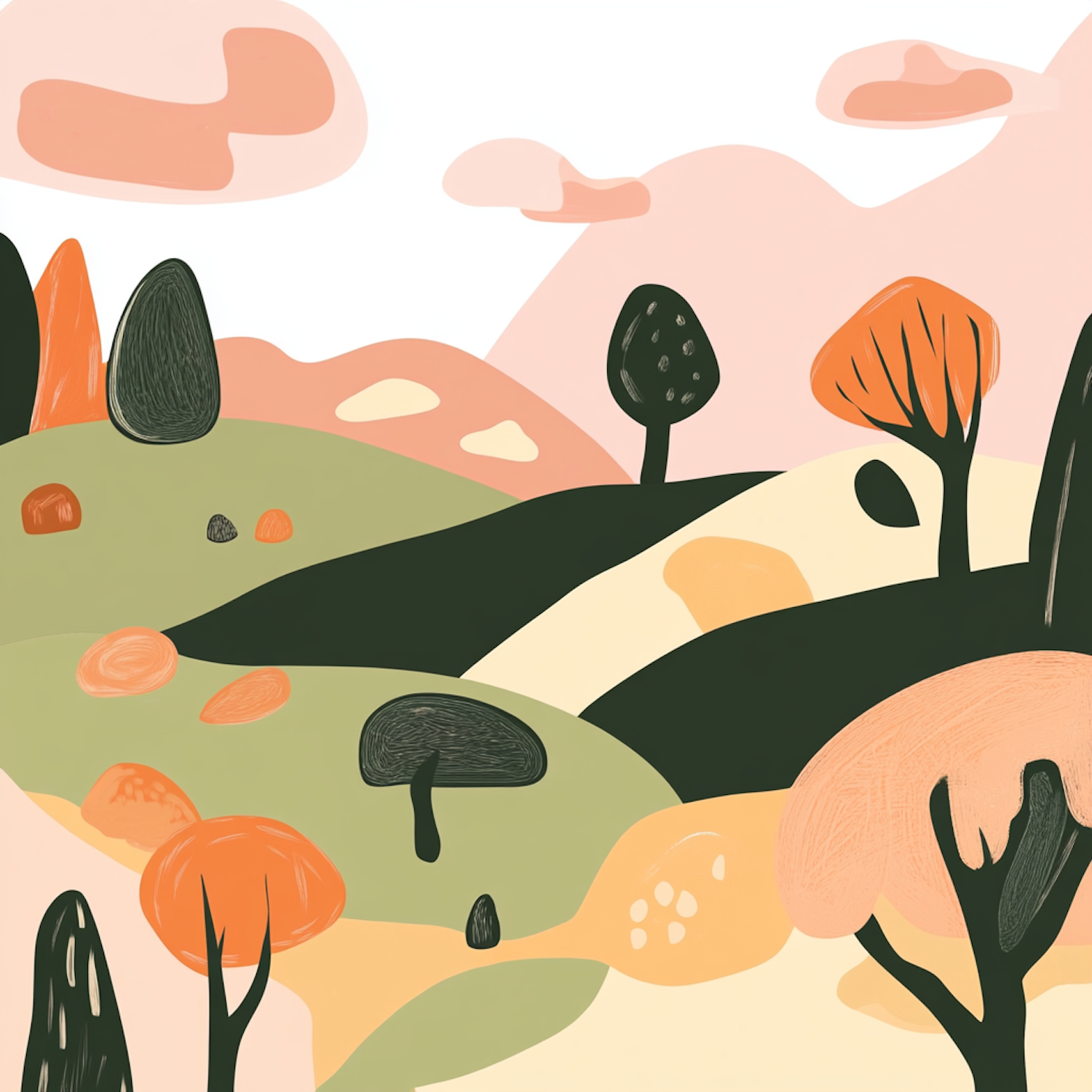 Whimsical landscape illustration with pastel hills, stylized trees, and abstract clouds in soft peach and green tones.
