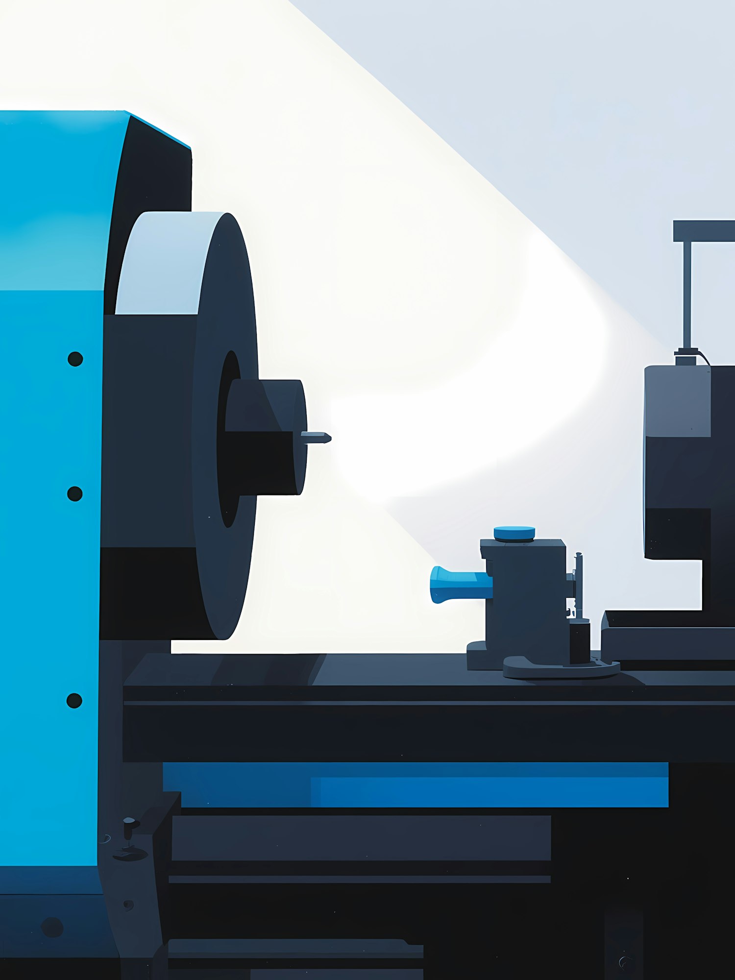 Stylized illustration of a lathe machine in blue and black tones, showcasing its components with a clean and minimalistic design.