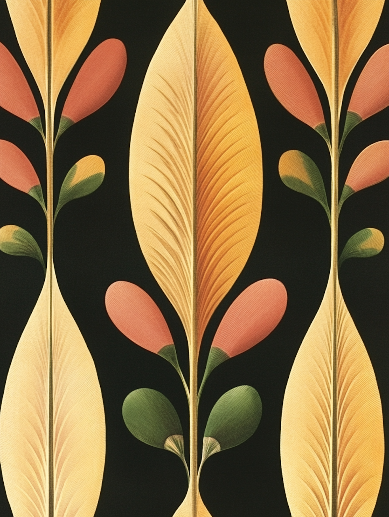 Stylized leaf and bud pattern with warm colors on a dark background, featuring detailed veins and symmetrical design.