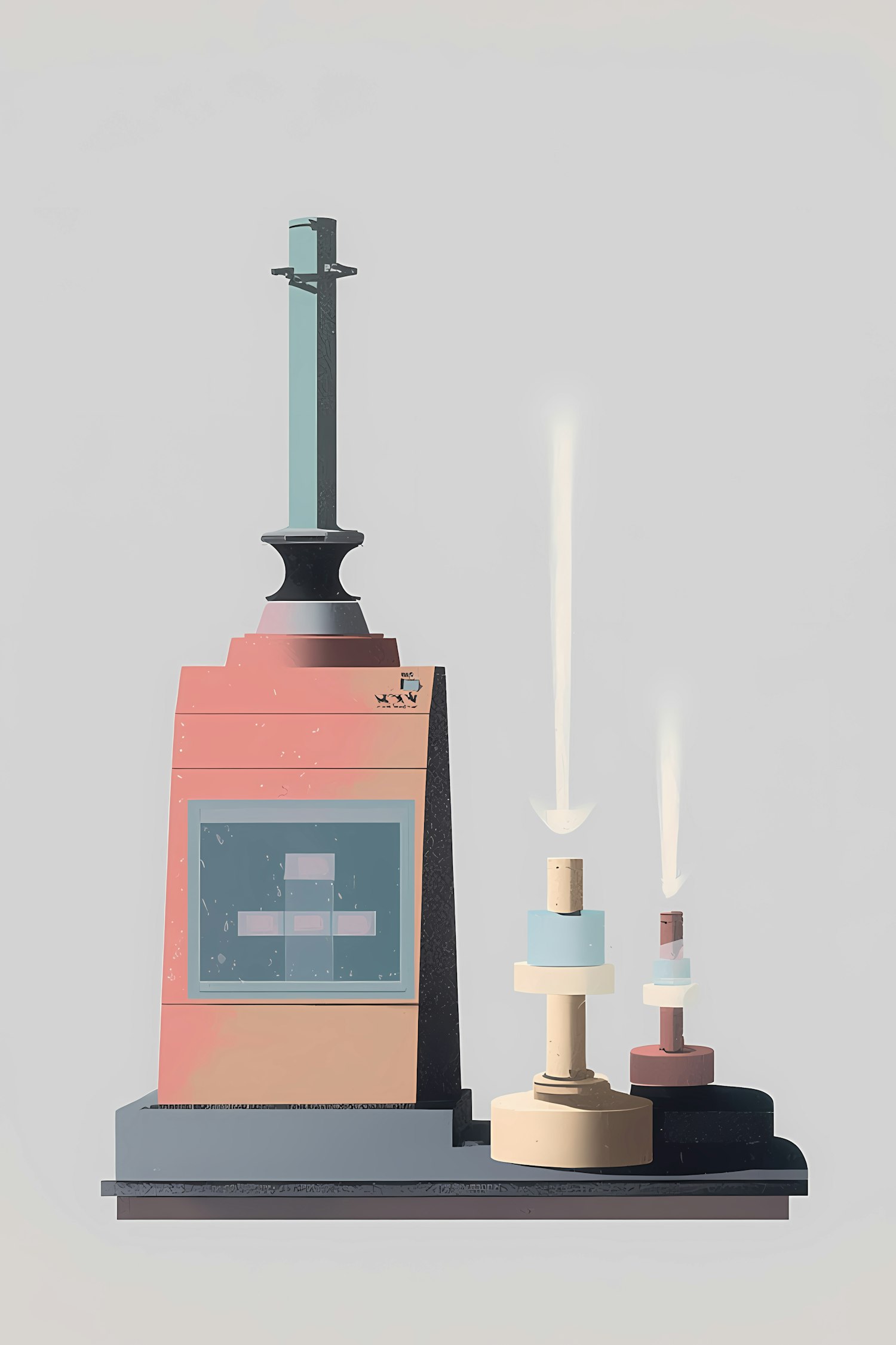 Stylized illustration of a mechanical setup with a tall base, vertical rod, and light-emitting cylinders on a minimalistic background.
