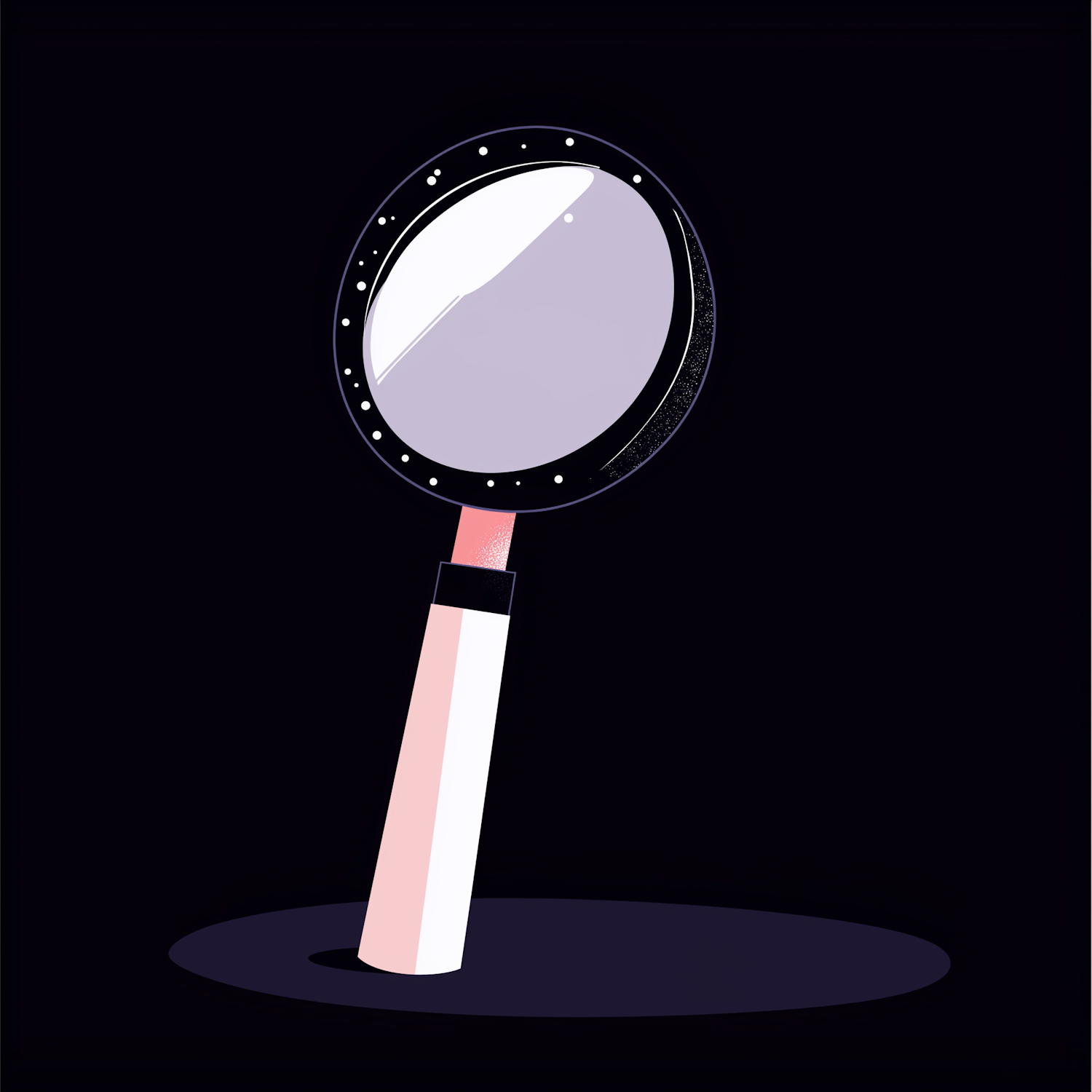 Stylized illustration of a magnifying glass with a pink handle on a dark background, emphasizing simplicity and contrast.