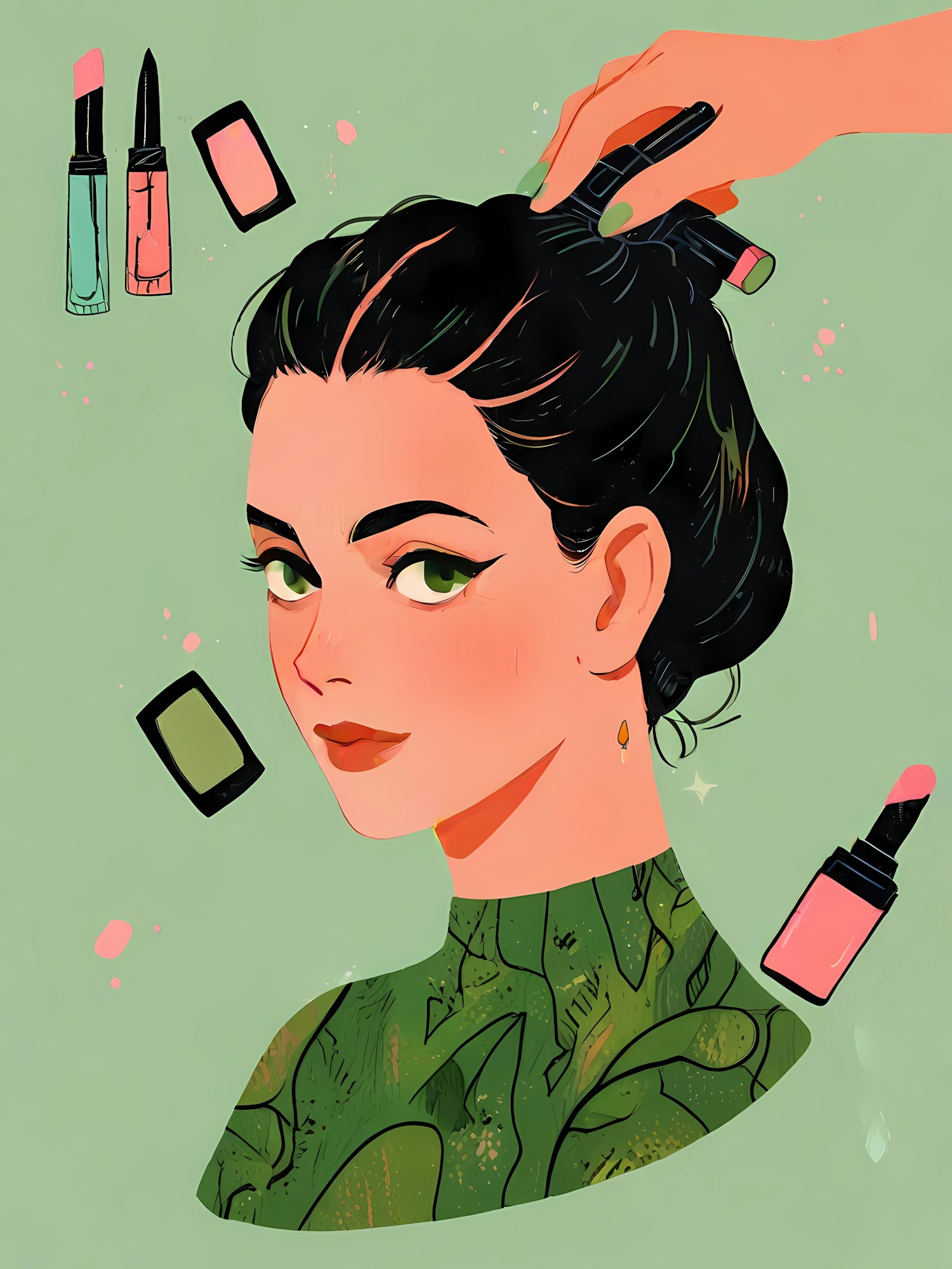 Stylized illustration of a woman with green eyes, dark hair, and floating makeup items in a pastel green background. Vibrant and artistic.