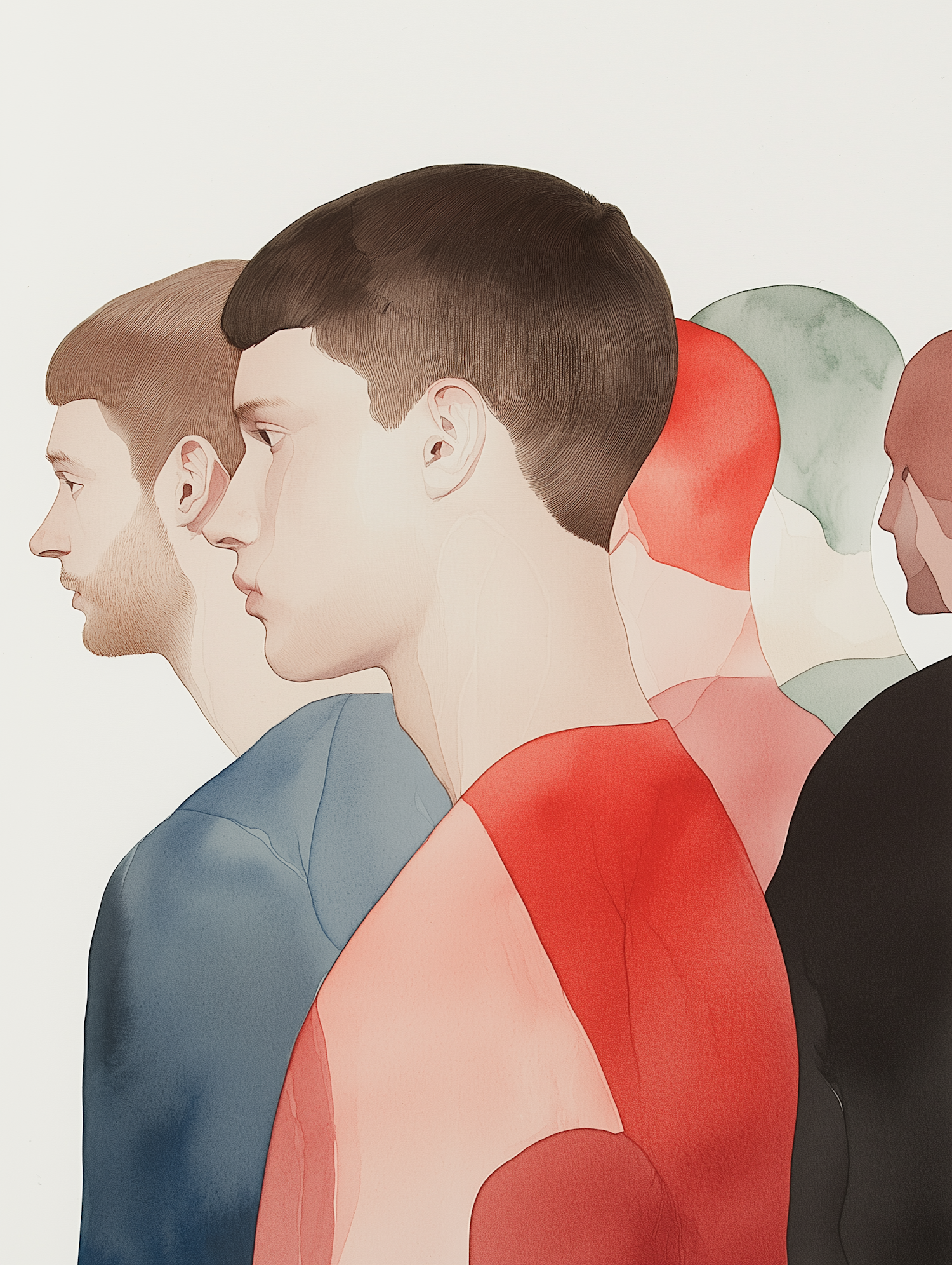 Stylized watercolor illustration of five male profiles in layered composition, featuring soft gradients and muted tones.