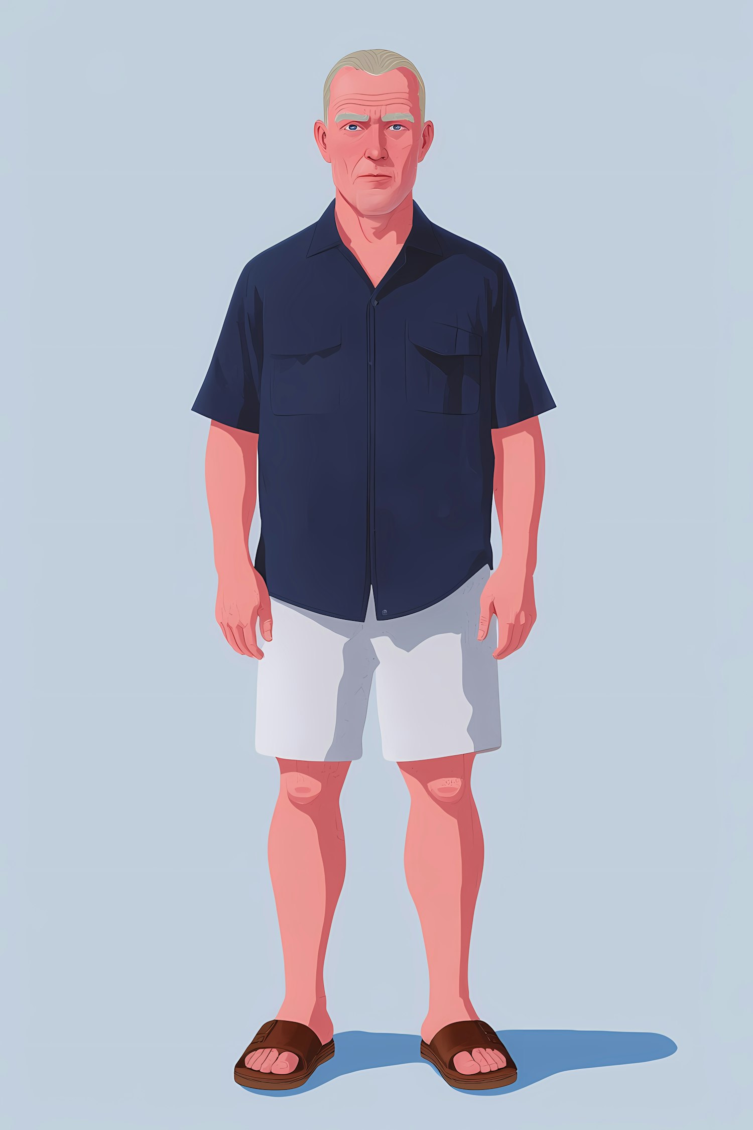 Stylized illustration of a man in a navy shirt, white shorts, and sandals, standing against a light blue background.