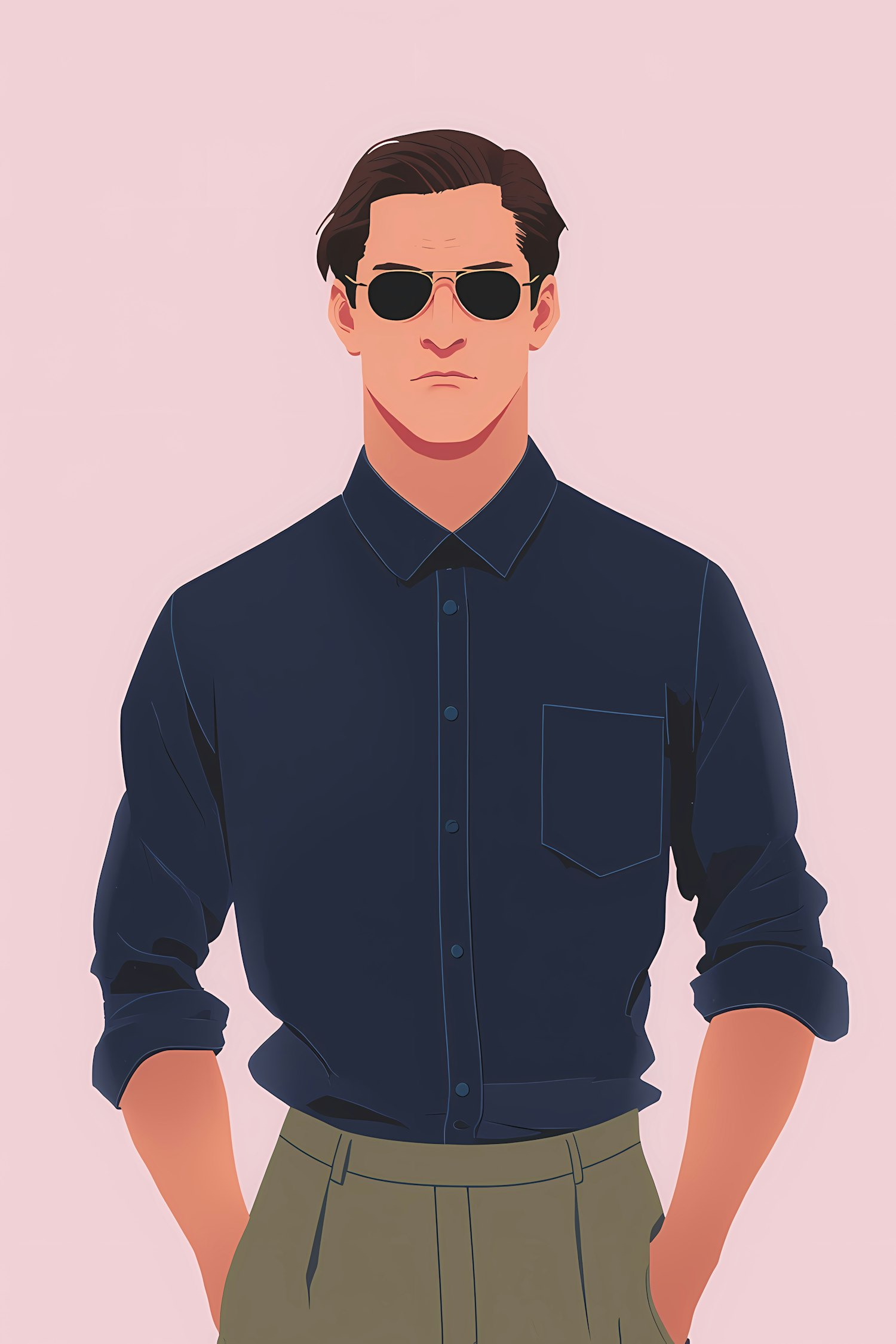 Stylized illustration of a man in a dark blue shirt and khaki pants, wearing sunglasses, set against a light pink background.