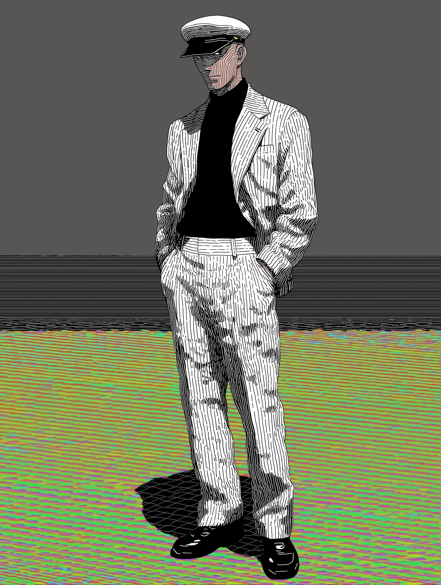 Stylized illustration of a man in a white pinstripe suit and captain's hat, set against a minimalistic, textured background.