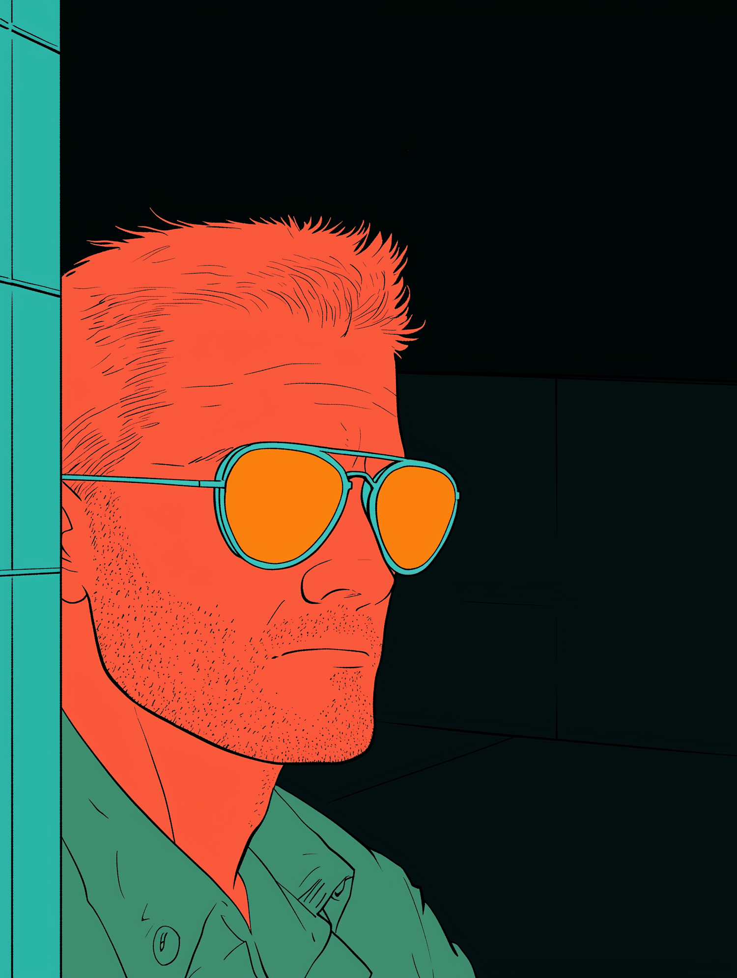 Stylized illustration of a man with orange skin and sunglasses, set against a black background with teal accents.