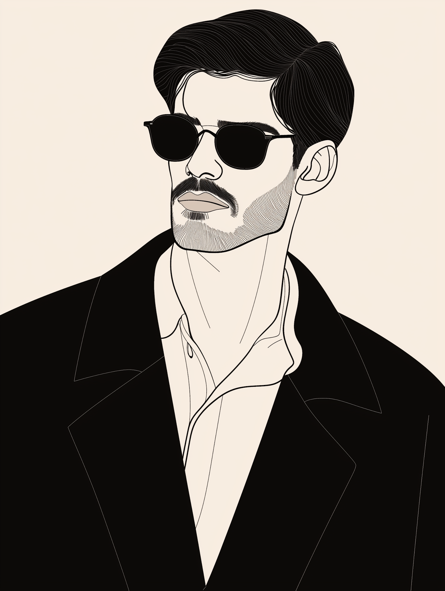 Stylized illustration of a man in sunglasses and a dark coat, exuding confidence and modern style against a beige background.