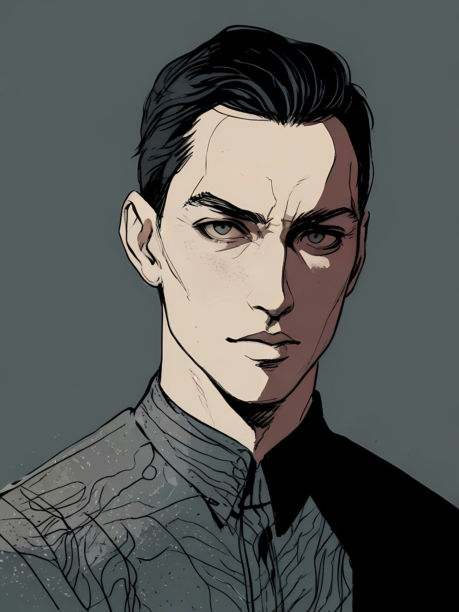Digital illustration of a serious young man with dark hair and gray eyes, wearing a patterned shirt against a muted background.