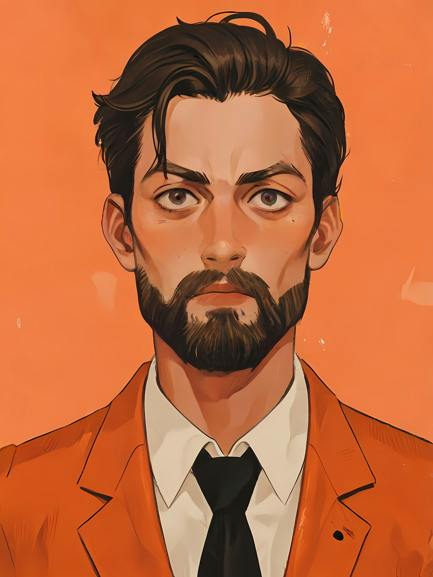 Illustration of a man in an orange suit with a beard and dark hair, set against an orange background.