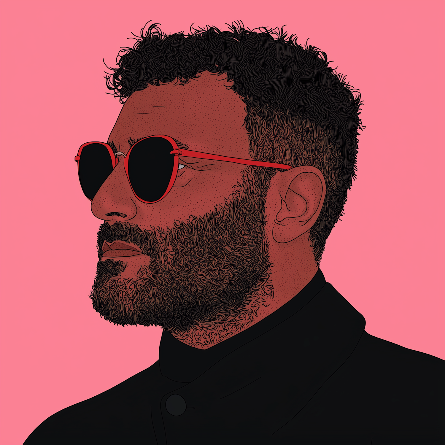 Stylized illustration of a bearded man with red sunglasses against a pink background, featuring bold lines and a limited color palette.