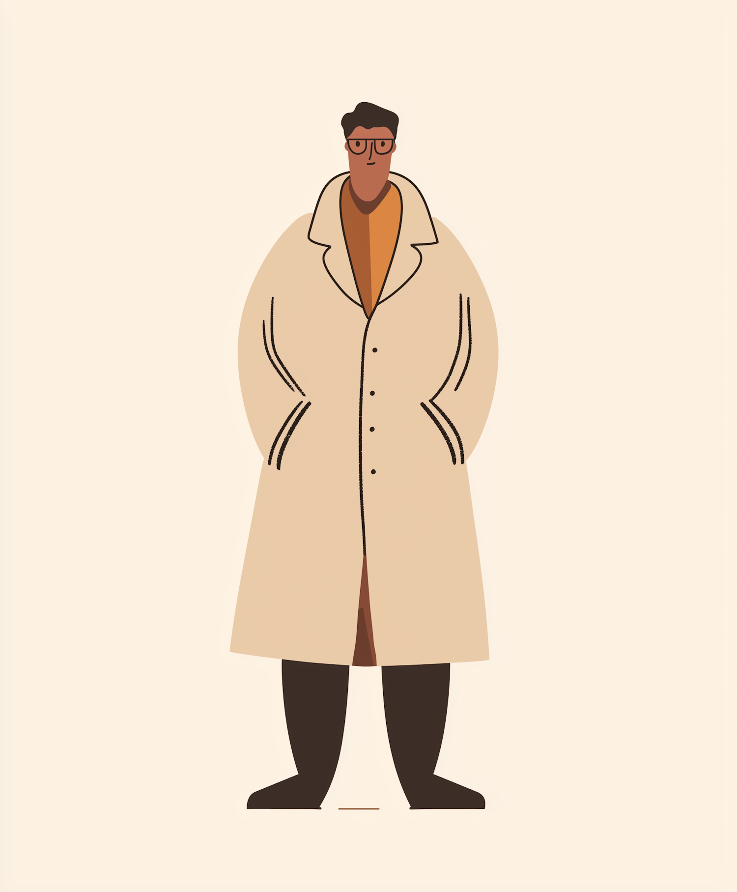 Stylized illustration of a person in a beige coat with glasses, set against a light background. Minimalist and modern design.
