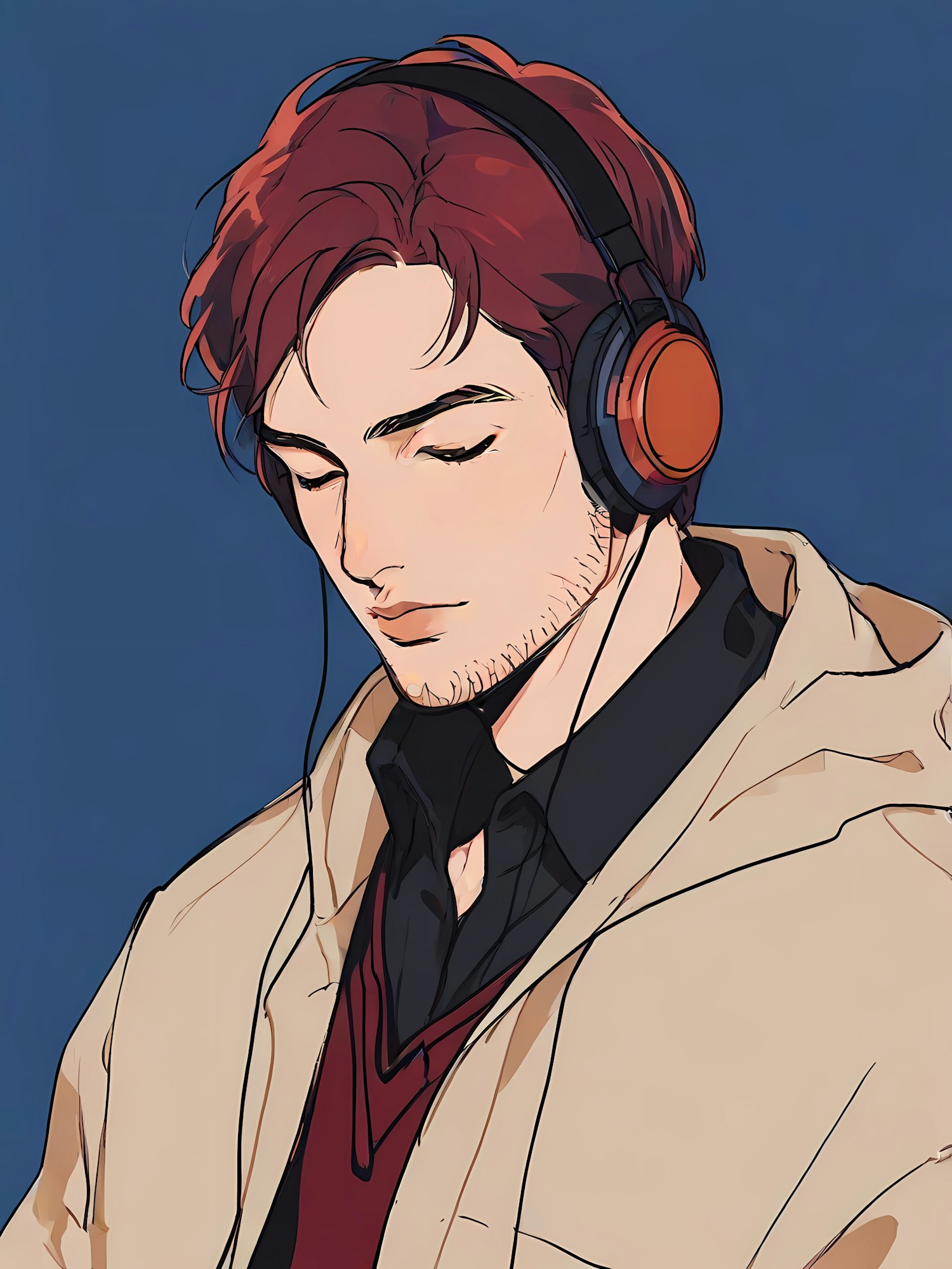 Stylized illustration of a red-haired man with headphones, eyes closed, wearing a beige coat and burgundy sweater against a blue background.