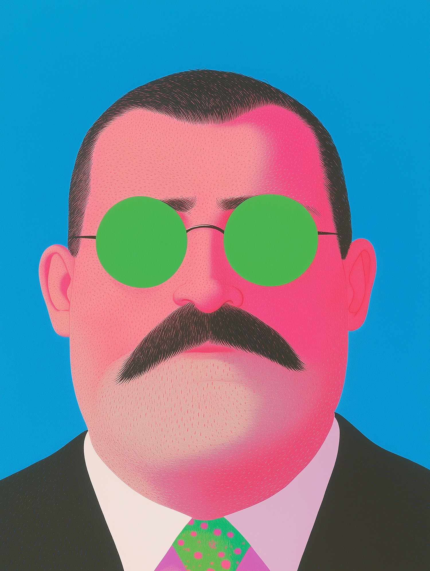 Bold illustration of a man with green sunglasses, pink face, black mustache, and a polka-dot tie against a bright blue background.