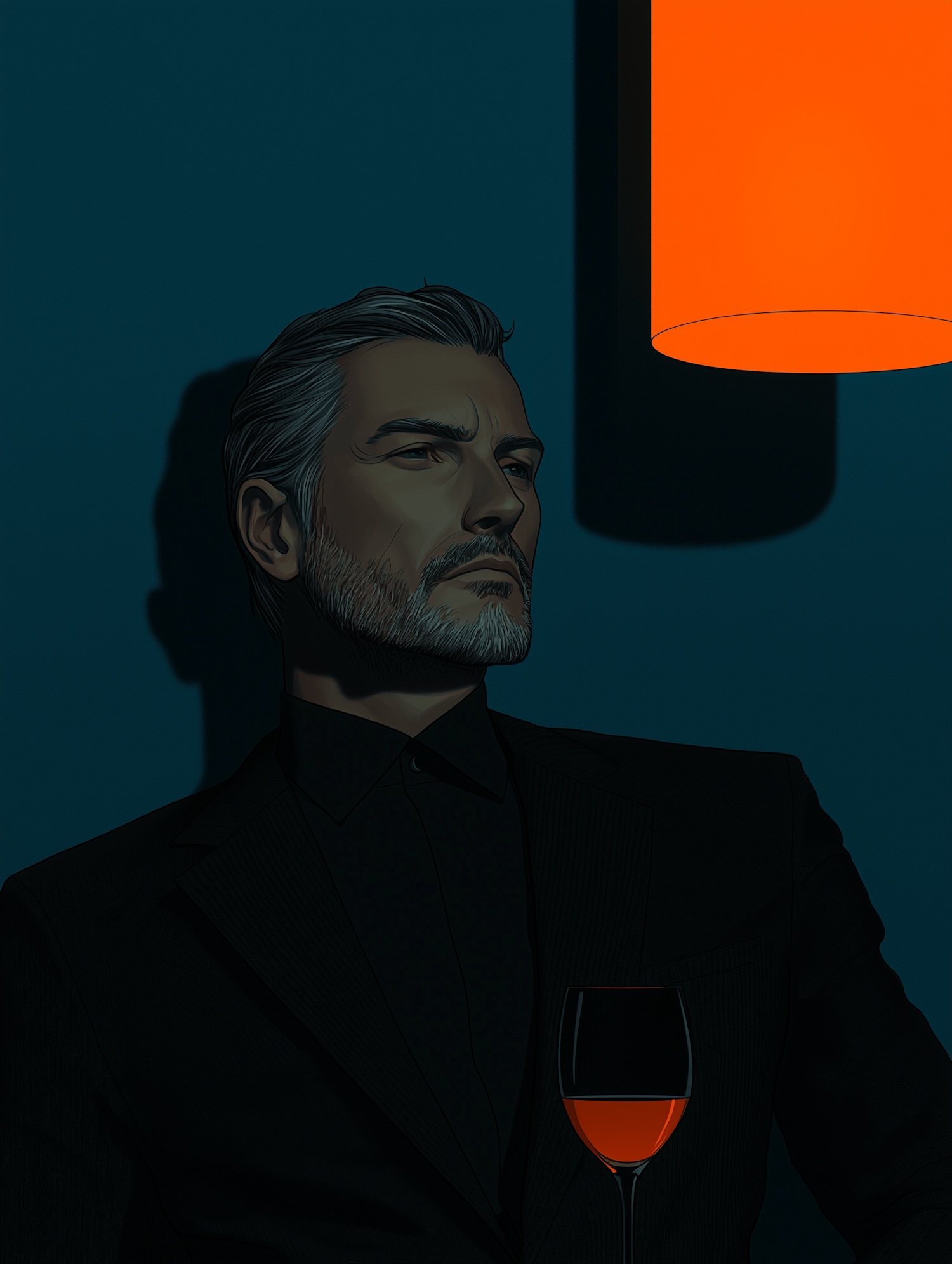 Stylized illustration of a man in a black suit with gray hair and beard, under a glowing orange light, with a glass of red wine.