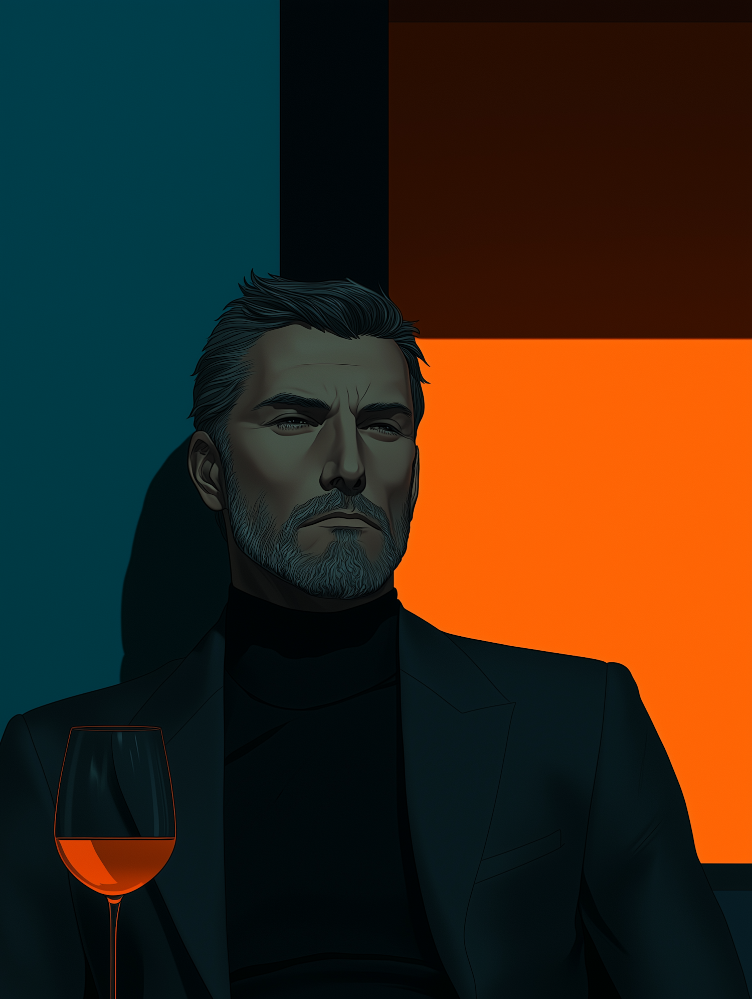Stylized illustration of a man with gray hair and beard, a glass of orange liquid, and a bold geometric background in teal and orange.