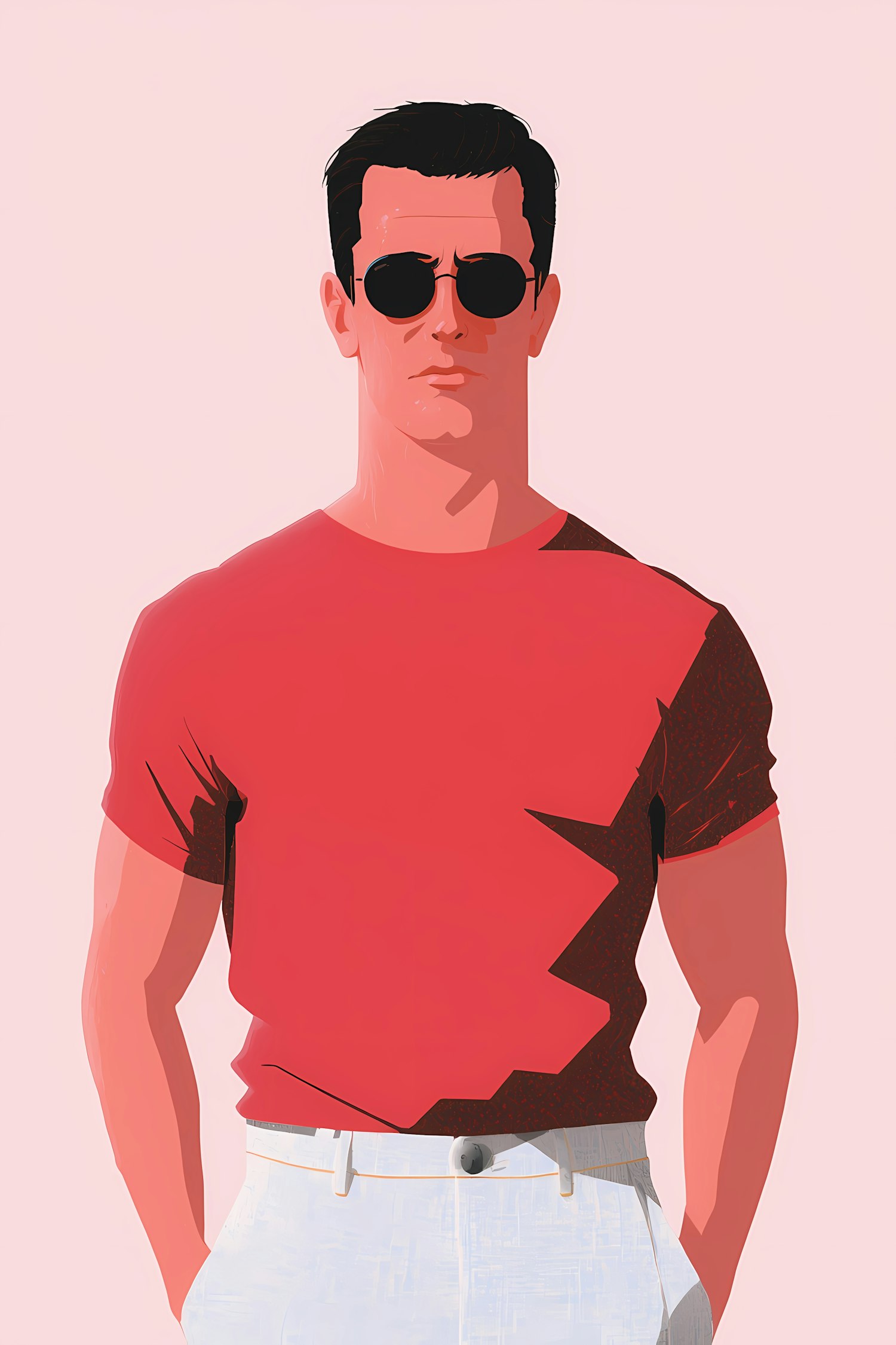 Stylized illustration of a man in a red shirt and sunglasses against a pink background, showcasing bold colors and clean lines.