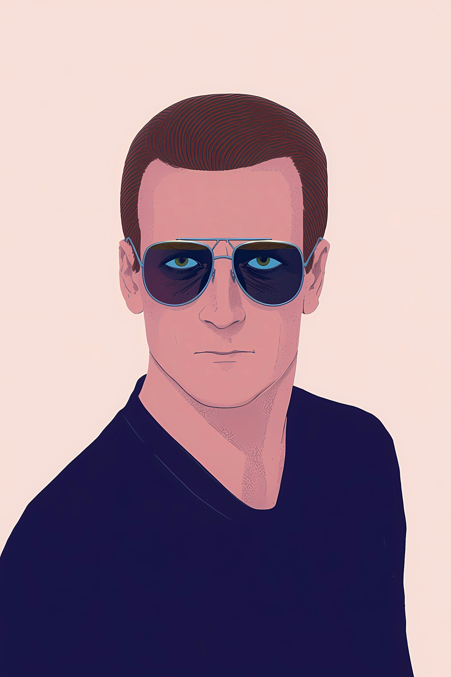Stylized illustration of a man with aviator sunglasses, short hair, and a navy shirt against a pastel pink background.