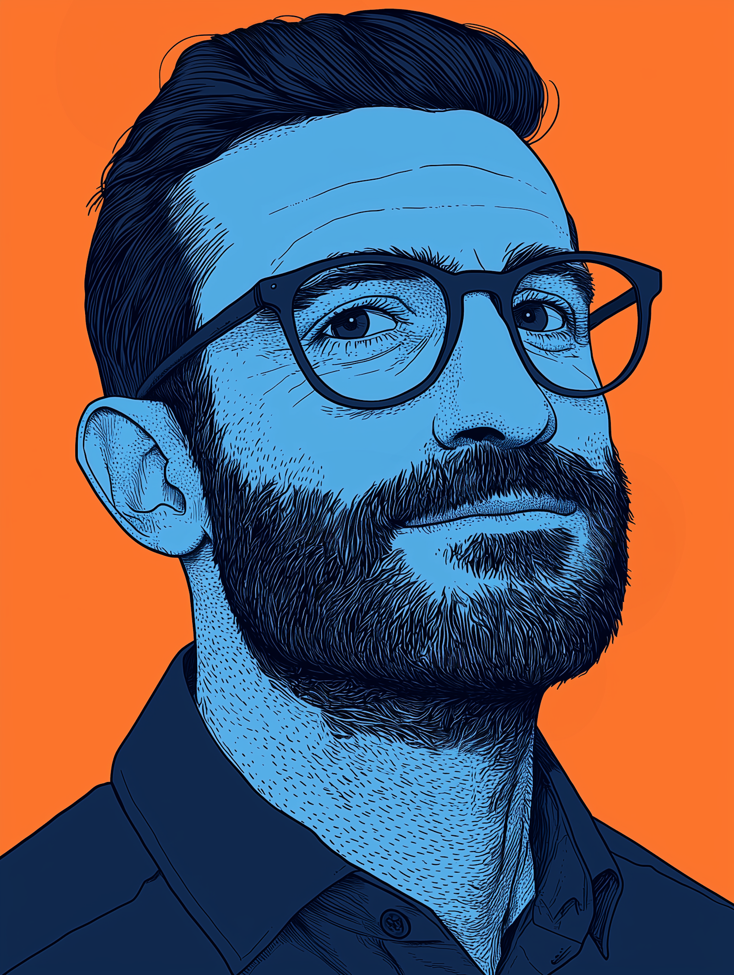 Stylized illustration of a bearded man with glasses, blue skin tones, and an orange background, creating a bold and modern graphic look.